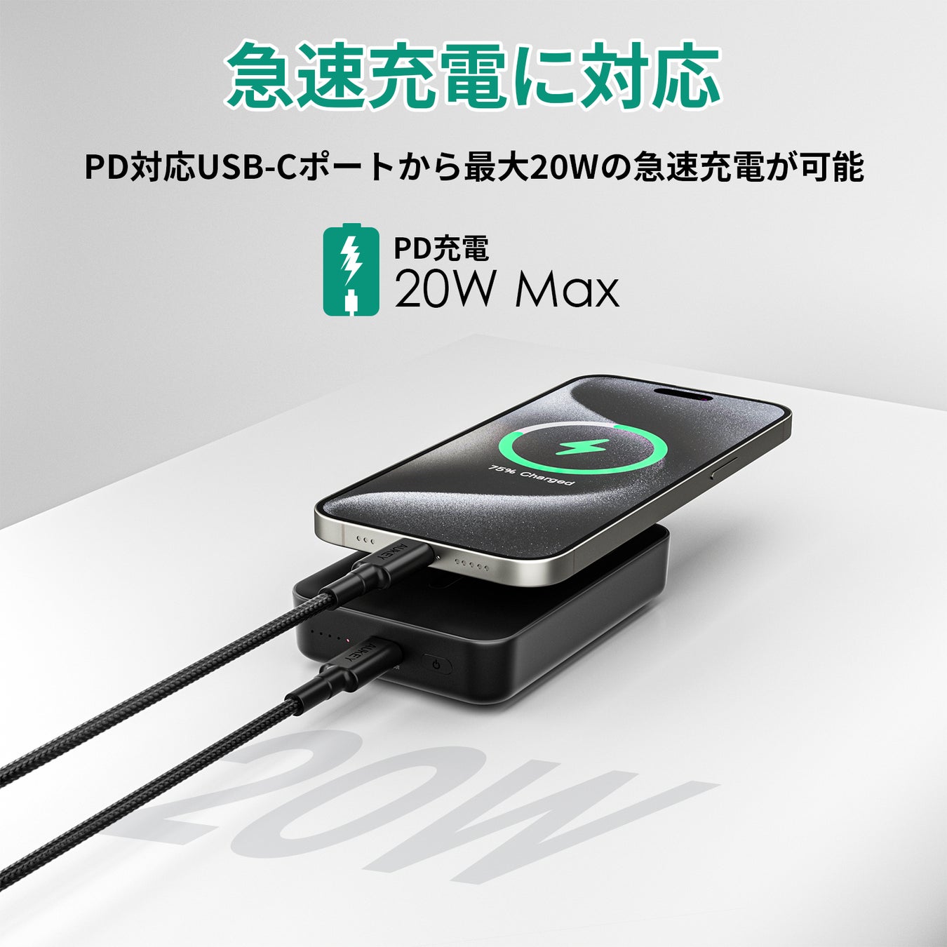 USB-Cポートは20W PDをサポートしており、移動中や時間のない時でもスピーディーに充電の完了が可能です。幅広いUSB機器への急速充電に使用できます。