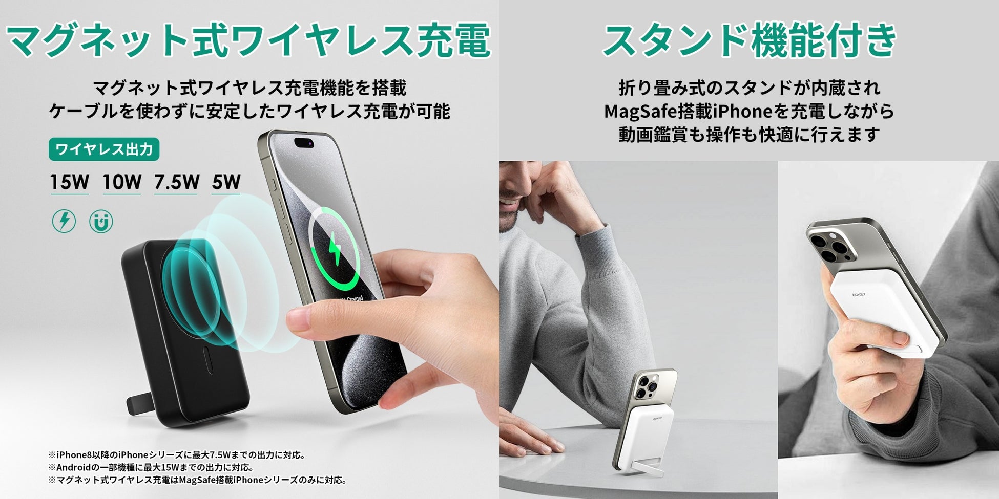 本体には強力なマグネットが内蔵されており、MagSafe搭載iPhoneシリーズが適切な充電位置にピタッとくっつきます。ケーブル不要で最大7.5W出力の安定したワイヤレス充電が可能です。移動中のカバンの中でも充電位置がズレにくく、安全に充電を行えます。