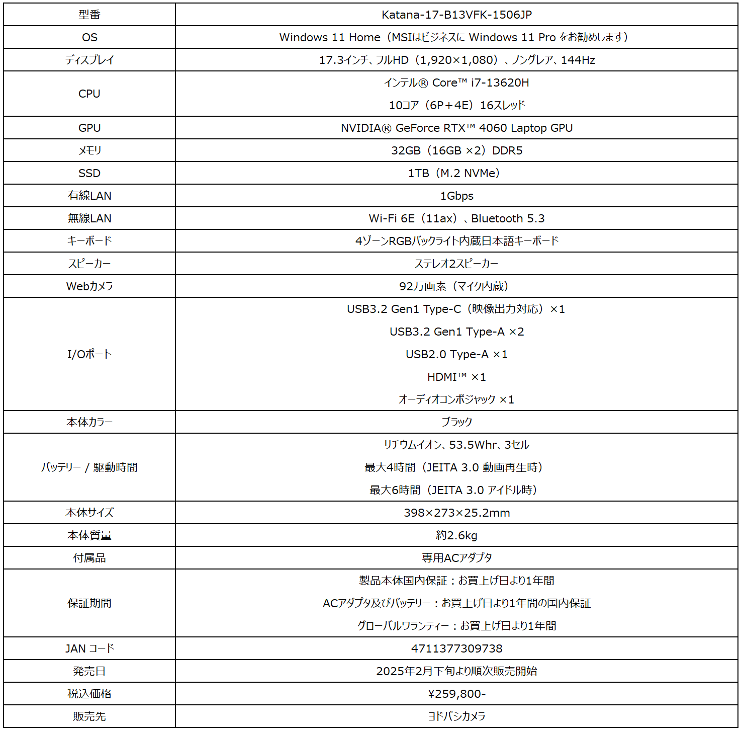 この度、エムエスアイコンピュータージャパン株式会社は、「Core™ i7-13620H」と「GeForce™ RTX 4060 Laptop GPU」に加え、一般的なノートPC向けディスプレイより2.4倍駆動の滑らか表示ディスプレイ(144Hz)を搭載し、2025年の最新ハンティングアクションゲームを快適にプレイするために必要な性能と機能を17.3インチ大画面ゲーミングノートPCのヨドバシカメラ限定モデル「Katana-17-B13VFK-1506JP」を2025年2月下旬より順次販売開始いたします。