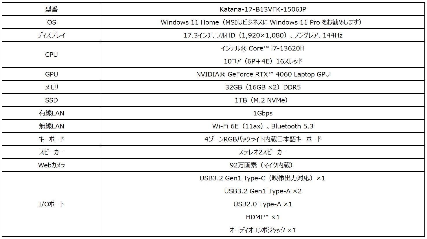 【Katana-17-B13VFK-1506JPの主な特徴】