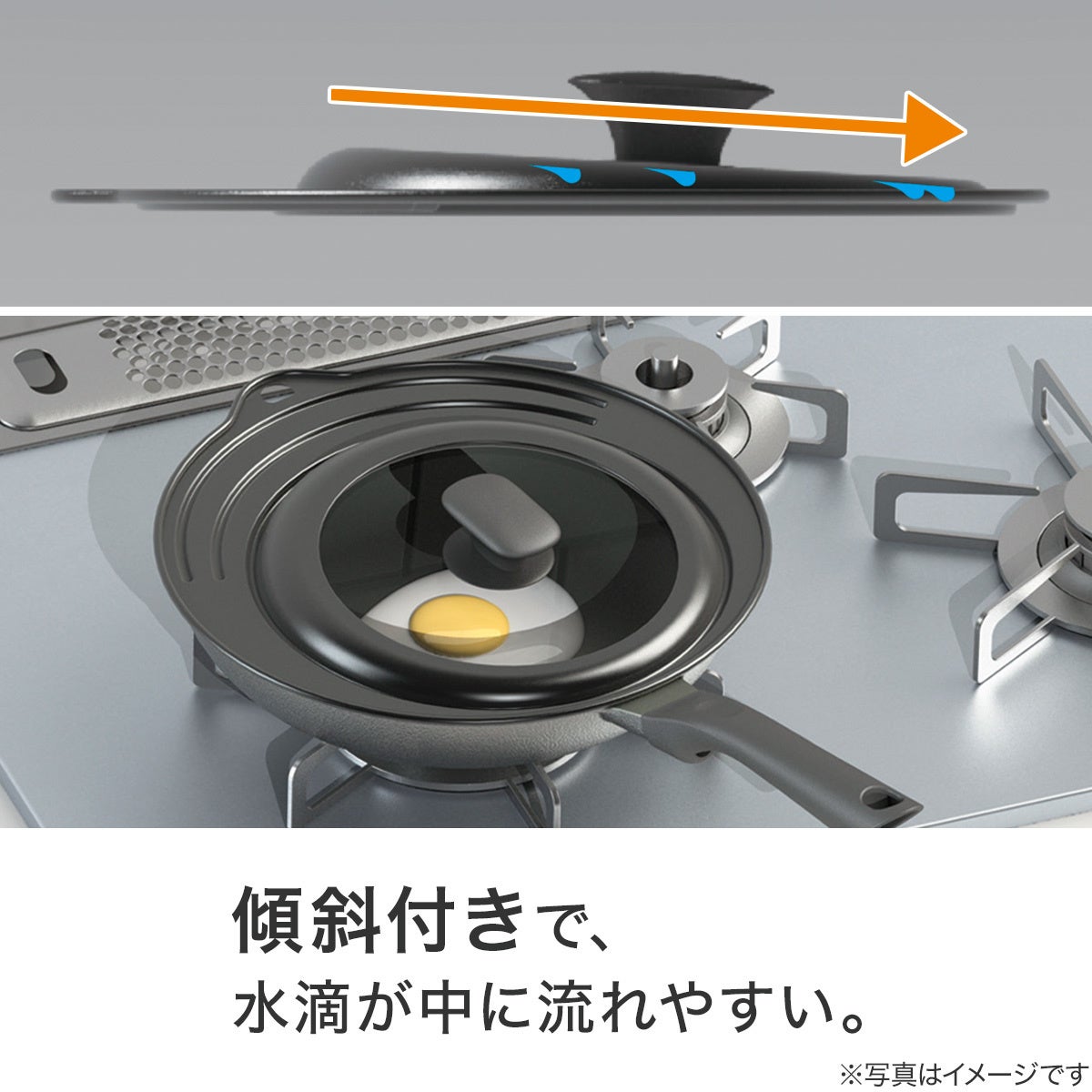 このフライパンカバーなら、ガラス面の位置を手前にずらして傾斜をつけることで、のぞき込むことなく中の様子が見やすくなりました。