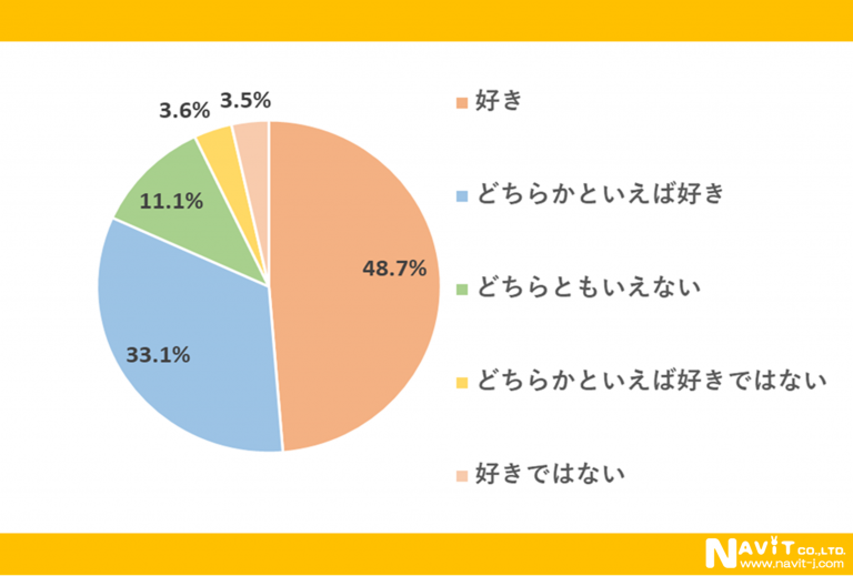 スナック菓子は好きかどうかについては、「好き」が48.7%、「どちらかといえば好き」が33.1%という結果になり、合わせると80%以上の人がスナック菓子を好きだと回答していました。