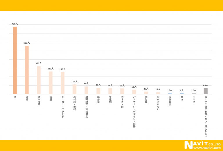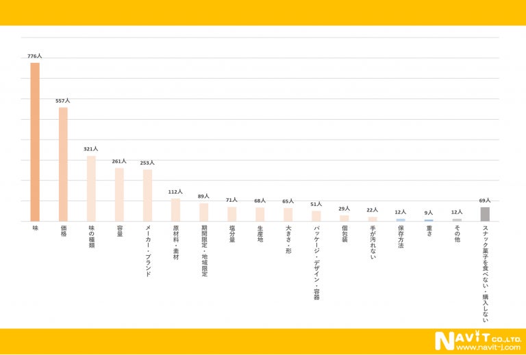「スナック菓子を購入する際、重要視する点は何ですか?」という質問を複数選択可能で行ったところ、「味」が27.9%、「価格」が20.1%、「味の種類」が11.6%という順になりました。