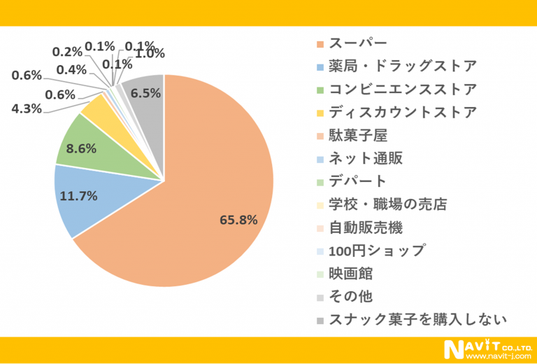 スナック菓子を最も購入する場所については、「スーパー」が65.8%、「薬局・ドラッグストア」が11.7%、「コンビニエンスストア」が8.6%という順になりました。お買い物のついでに買いやすいスーパーで購入されている方が多いのかもしれませんね。