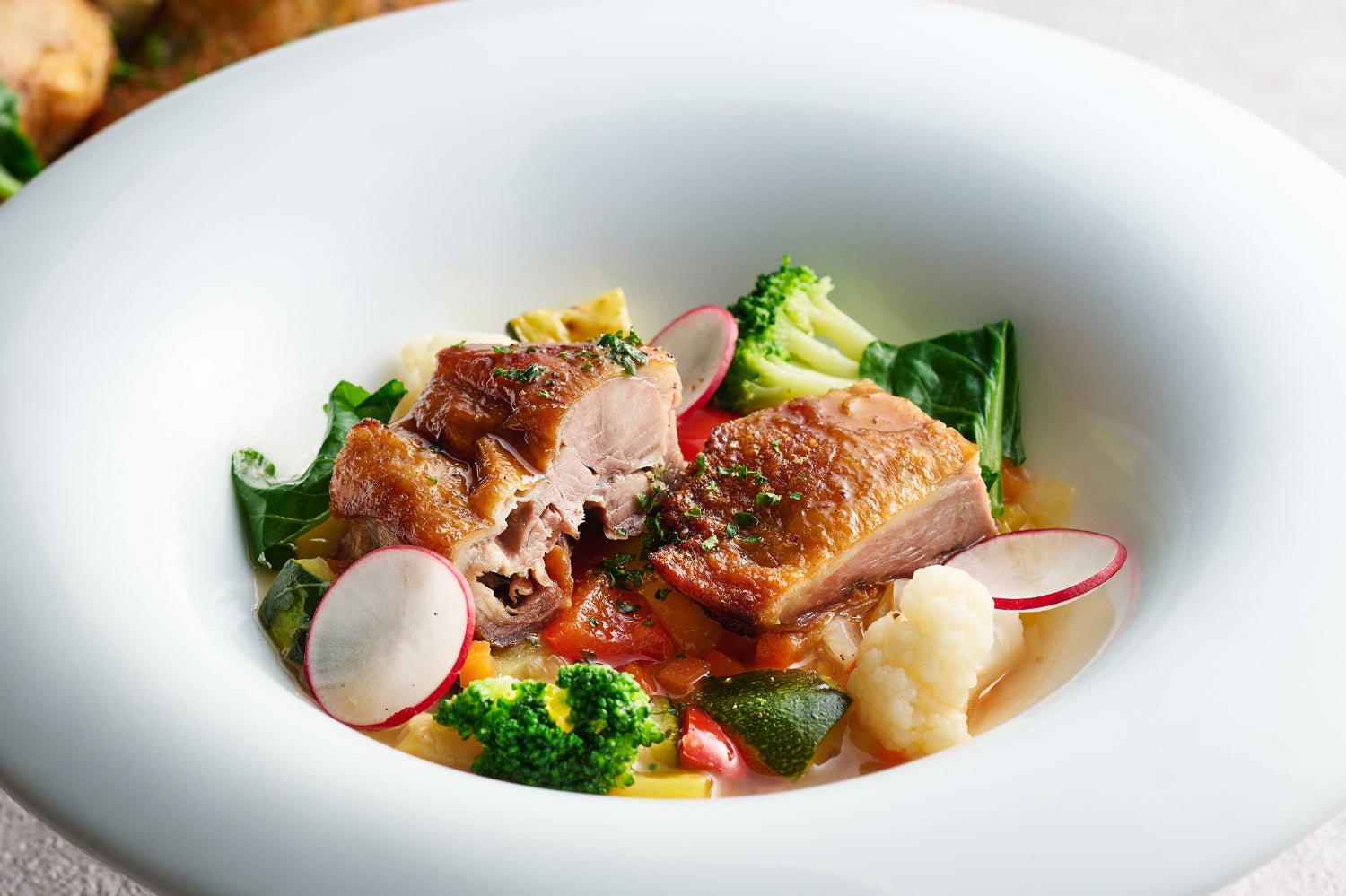 ブイヤベースの出汁を使い、香住ガニと雲子に優しく火入れすることで、香住ガニのうま味を最大限に引き出した、この季節ならではの一品。