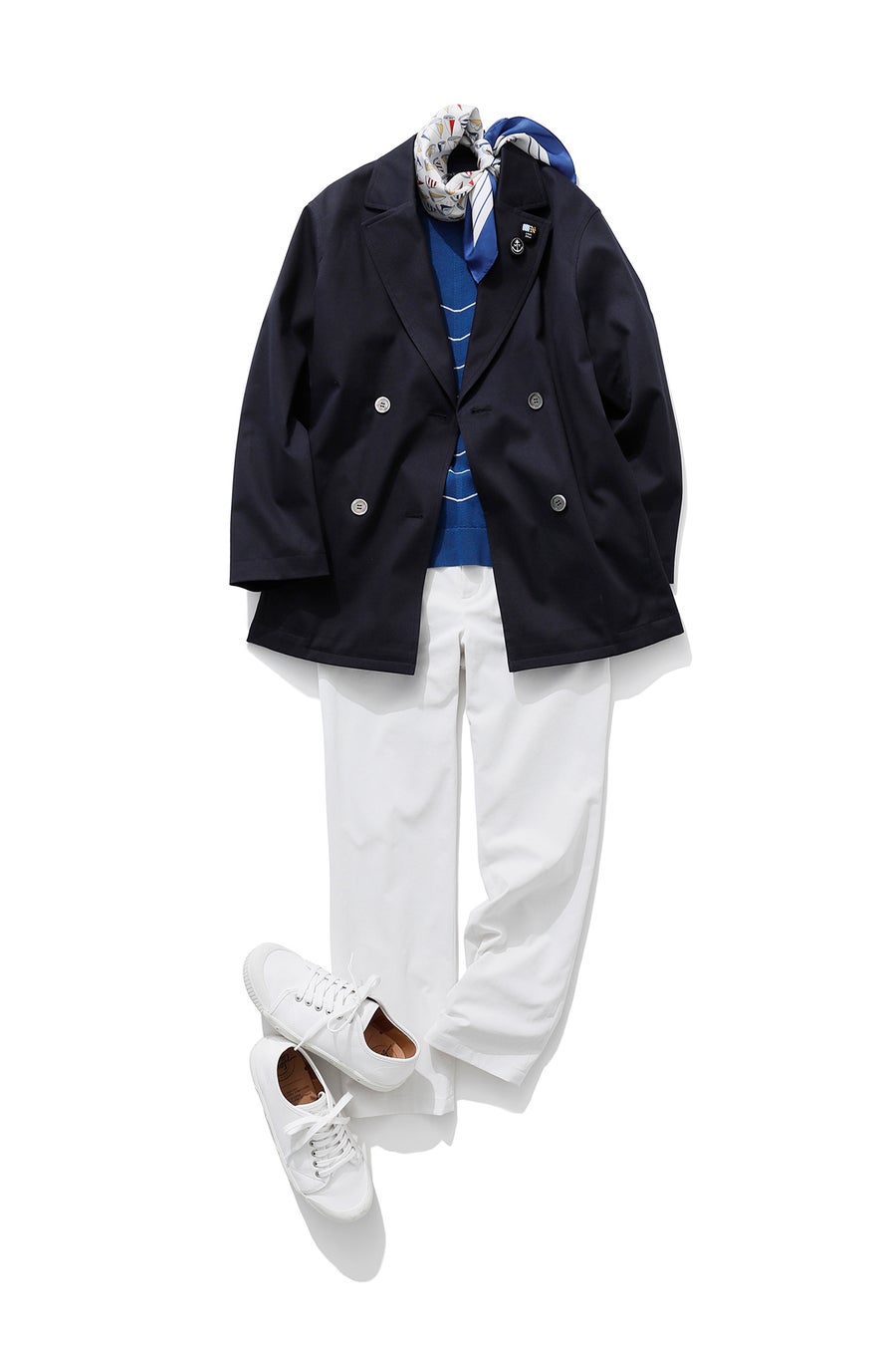 サッと羽織れるボクシーなシルエットで、裏地にはハウスタータンのパイピングを施 しました。マリンモチーフのピンブローチとイ タリアの老舗テキスタイルメーカー・マンテロ 社のオリジナルスカーフを合わせれば、一足早く春の雰囲気が楽しめます。