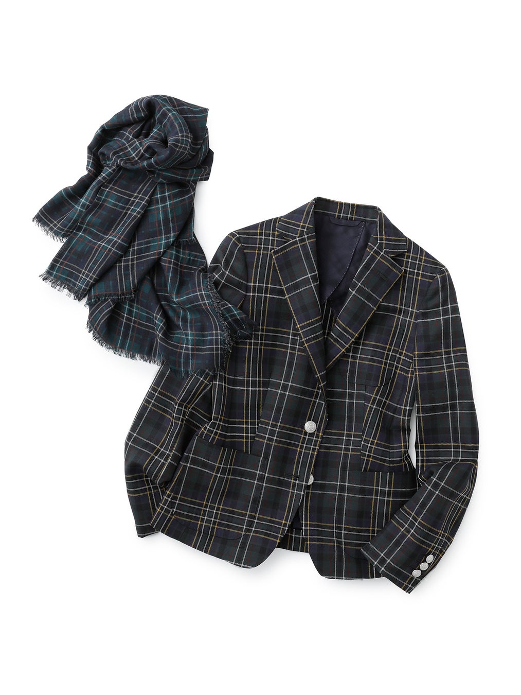 80年代のチェックブレザーをアレンジし復刻したブレザー。ブ ラックウォッチをベースにオーバーペインをのせた6色のチェッ ク柄は、どこか懐かしくも華やかさを感じるトラッドらしい1枚 です。ストールはスタイリングで使いやすいよう、ブレザーより もブルーベースに仕上げました。