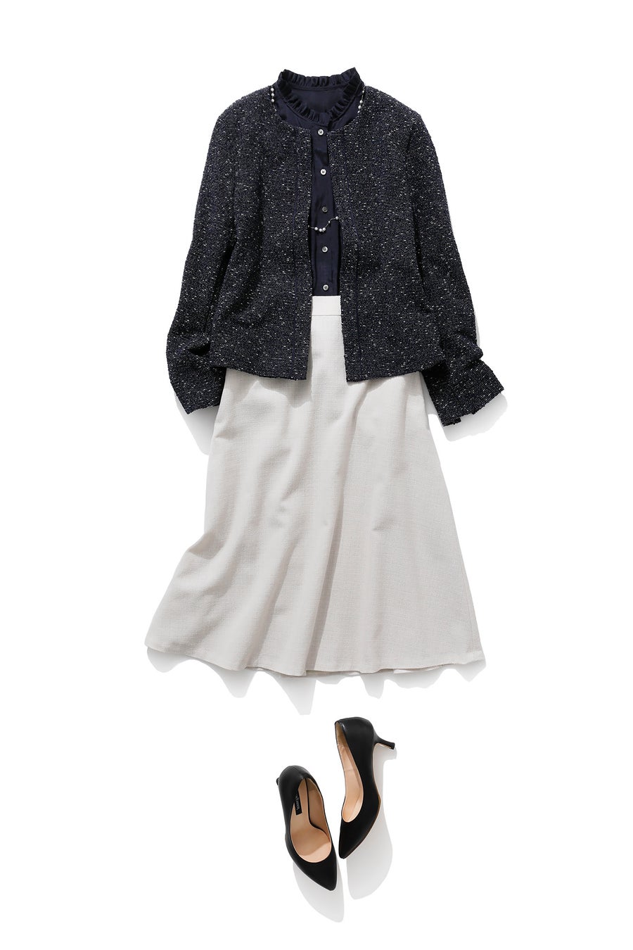 ハレの日には欠かせない、ツィードジャケットとの相性もバッチリ。ドットドビーのフリルブラウスで、