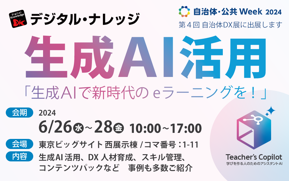 デジタル・ナレッジブースでは、「生成AI活用 生成AIで新時代のeラーニングを!」をテーマに生成AIの教育への活用や、eラーニングソリューションの展示やデモンストレーション、自治体・公共事業における数々の成功事例や、教育DXの最新動向をわかりやすくご紹介いたします。ぜひご来場ください。
