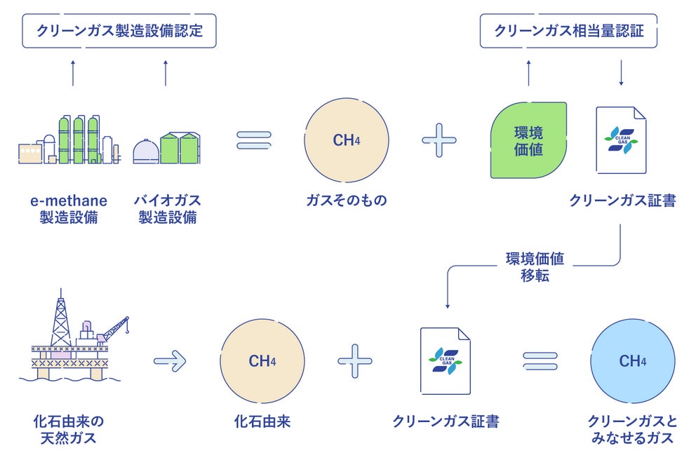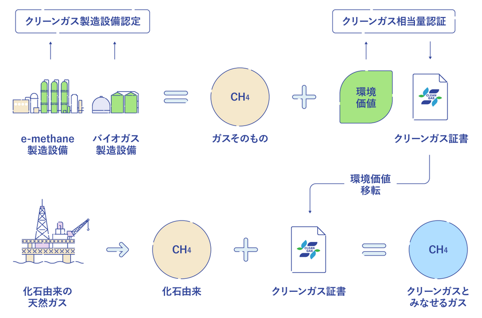 燃焼しても大気中のCO2が増えないとみなせる価値(環境価値)を持つe-メタンやバイオガスを対象に、クリーンガスとしての証書を発行する制度。クリーンガス証書評価委員会*4が製造設備の認定と、認定された設備により製造されたクリーンガス相当量の認証を通じて「クリーンガス証書」を発行することで、e-メタンやバイオガスの環境価値をエネルギー価値から分離し、移転可能となる。