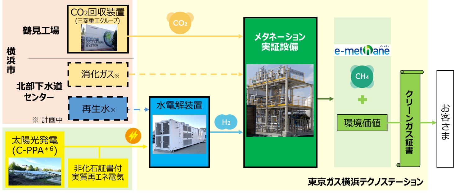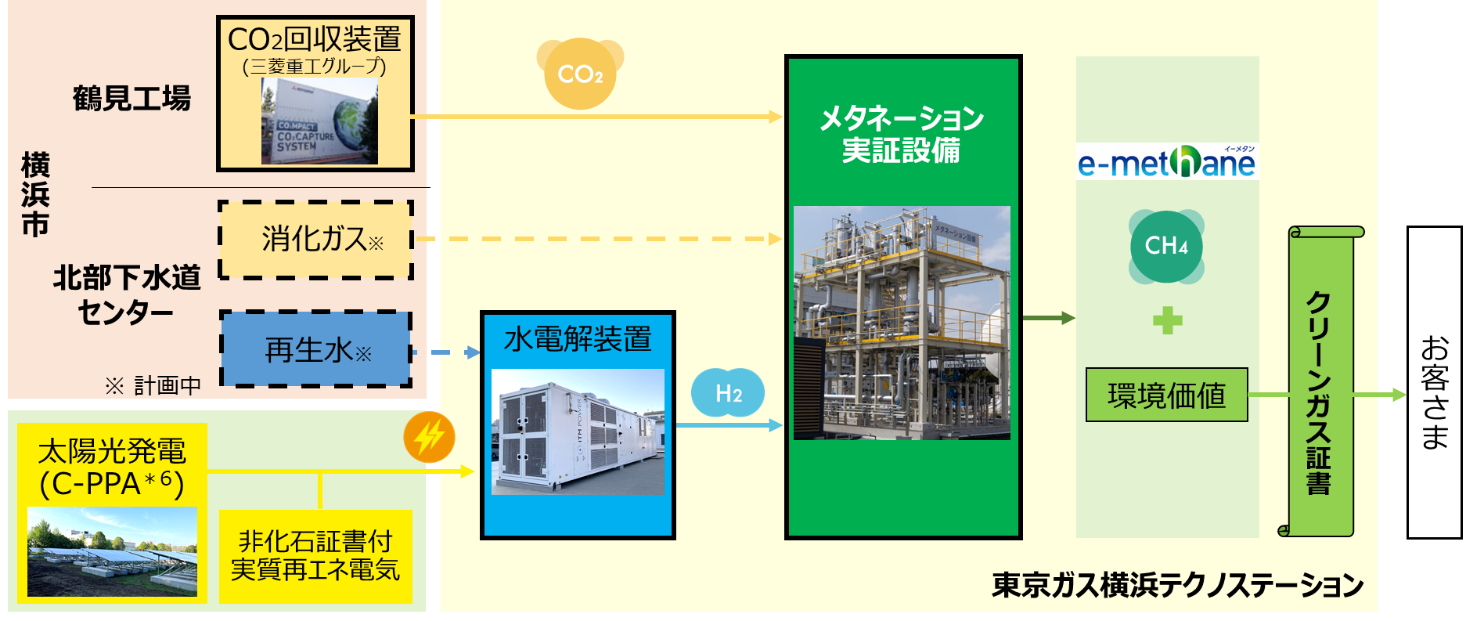 今年度中に、製造したe-メタンについてクリーンガス相当量の認証の取得を行うとともに、カーボンニュートラル実現に向け、e-メタンの環境価値移転に活用していきます。さらに、横浜市下水道河川局北部下水道センターで発生する消化ガスと再生水を活用したe-メタン製造も予定しています(*4)。