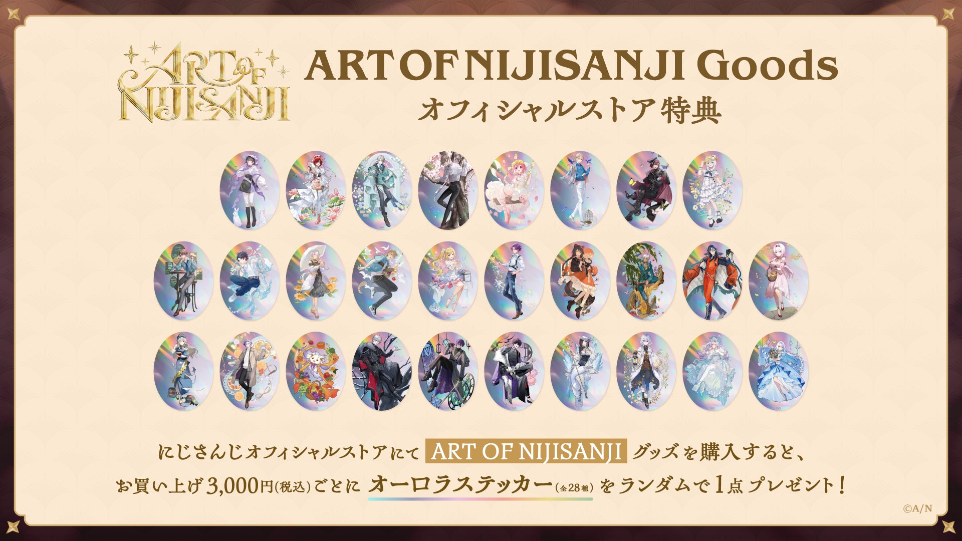 にじさんじオフィシャルストアにて「ART OF NIJISANJI」グッズを購入すると、お買い上げ3,000円(税込)ごとに「オーロラステッカー(全28種)」をランダムで1点プレゼント!