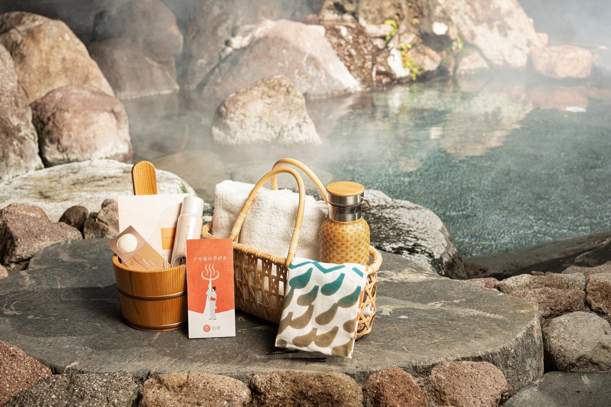 別府の伝統工芸品である竹細工を使用した籠には、湯巡りをする上で欠かせない手拭いや水筒などを揃えたジモ泉巡りセットを用意します。別府にある様々なジモ泉を気軽に楽しむことができます。