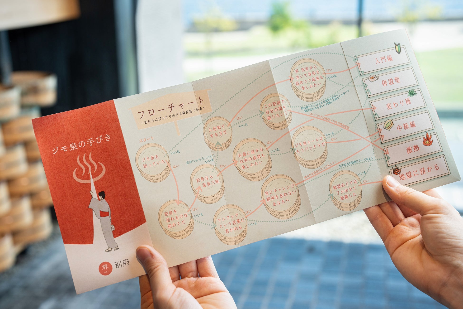 ジモ泉巡りセットには、複数の質問で構成されたフローチャートに沿って、好みやその時の気分に合ったジモ泉を見つけることができる「ジモ泉の手びき」が含まれます。「ジモ泉の手びき」を用いることで、好みの温泉を見つけるだけではなく、温泉療法専門医 早坂信哉氏監修の入浴時の注意点や、より楽しむためのヒントを知ることができます。