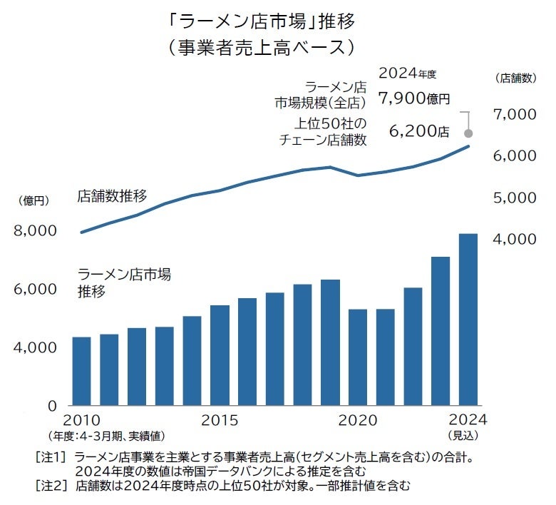 ラーメン店市場、2024年度は7900億円 10年前の1.6倍に拡大 主要チェーンの店舗数は6200店規模、過去10年で最多