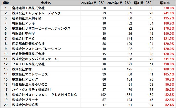 ・2024年1月時点と2025年1月時点の従業員数を比較