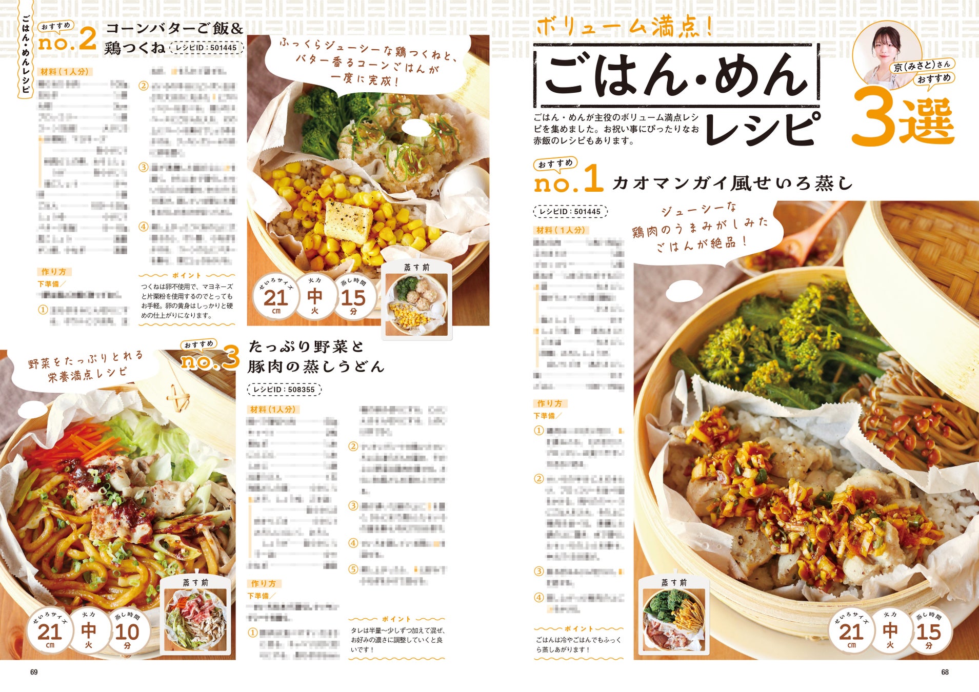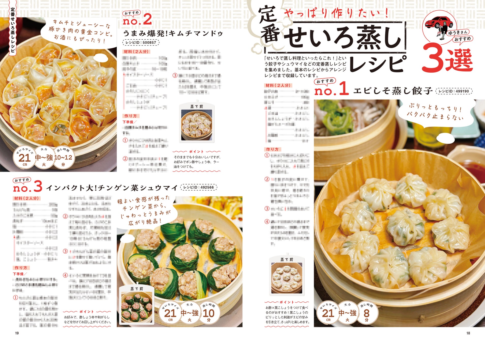 「せいろで蒸し料理と言ったらこれ!」という餃子やシュウマイなどの定番蒸しレシピも紹介。基本のレシピからアレンジレシピまで収録。