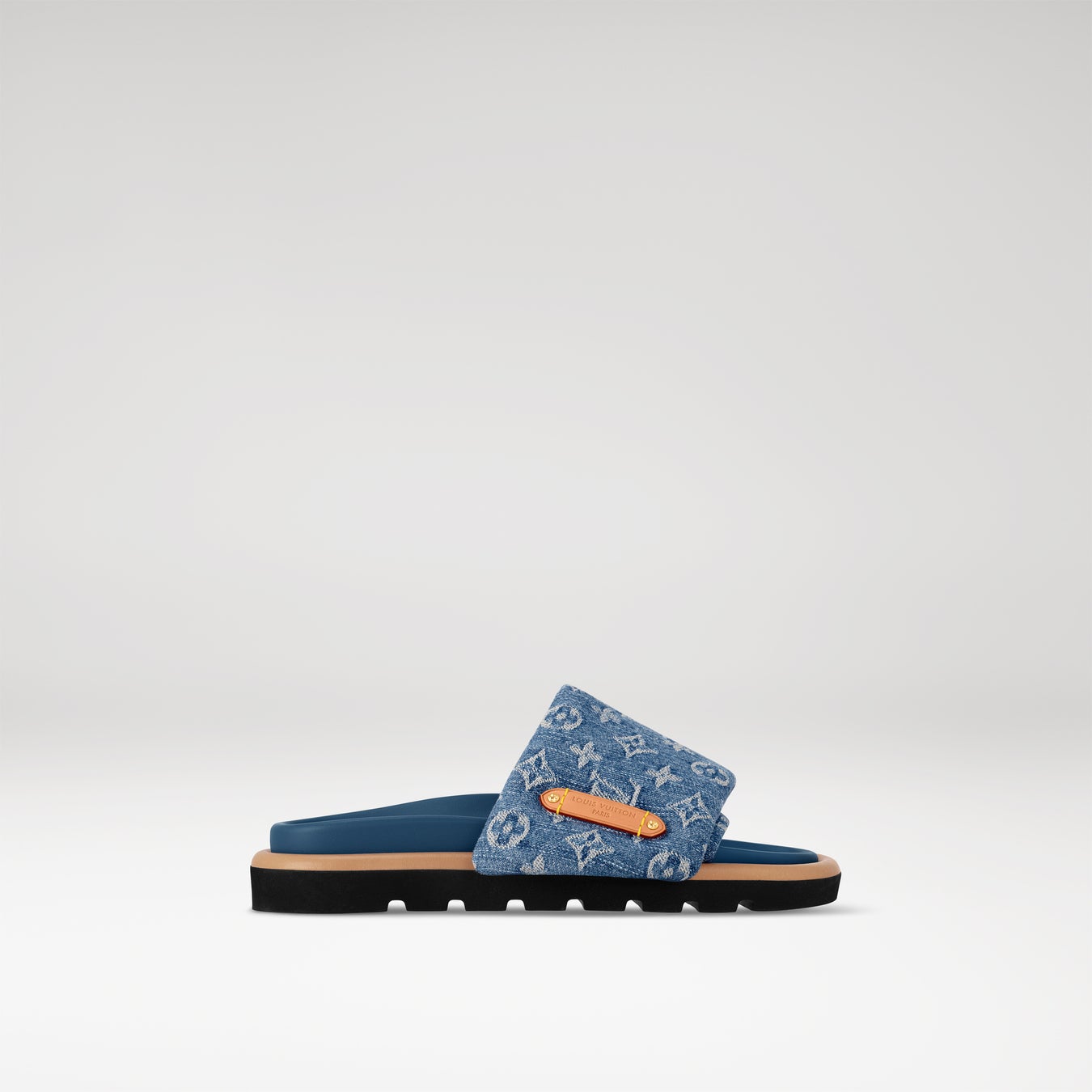 今シーズンのレザーグッズとのコーディネートも楽しめる、色褪せたようなモノグラム・デニムを使用した「プールピロー・ライン ミュール」。幅広のフロントストラップには、快適性を高めるパッド加工と、「Louis Vuitton」シグネチャーをエンボス加工で施したヌメ革のタグをあしらいました。アナトミックフットベッドとトレッド付きのマイクロアウトソールで仕上げました。