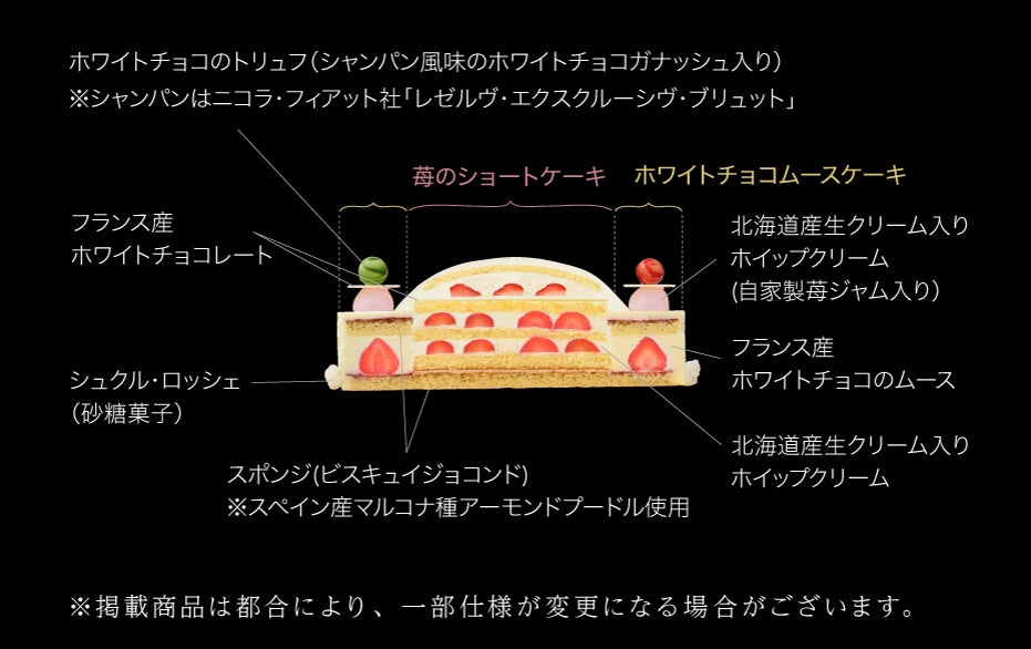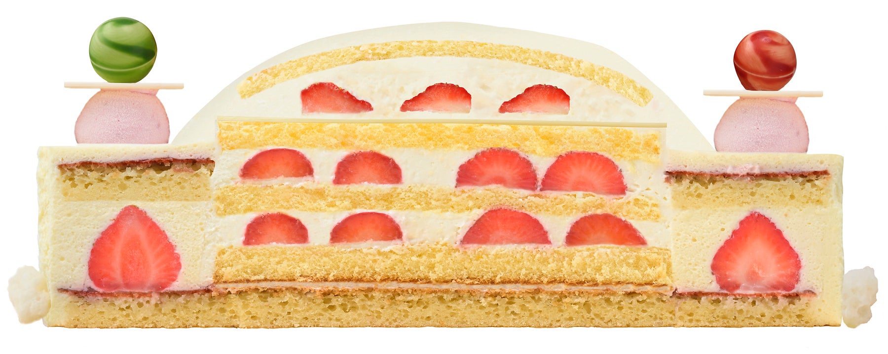 外側はホワイトチョコムースケーキ、内側は苺のショートケーキという、ケーキinケーキの技巧的な構造。断面の美しさに加え、1台で2種類のおいしさを楽しめる、豪華で美しいクリスマスケーキです。