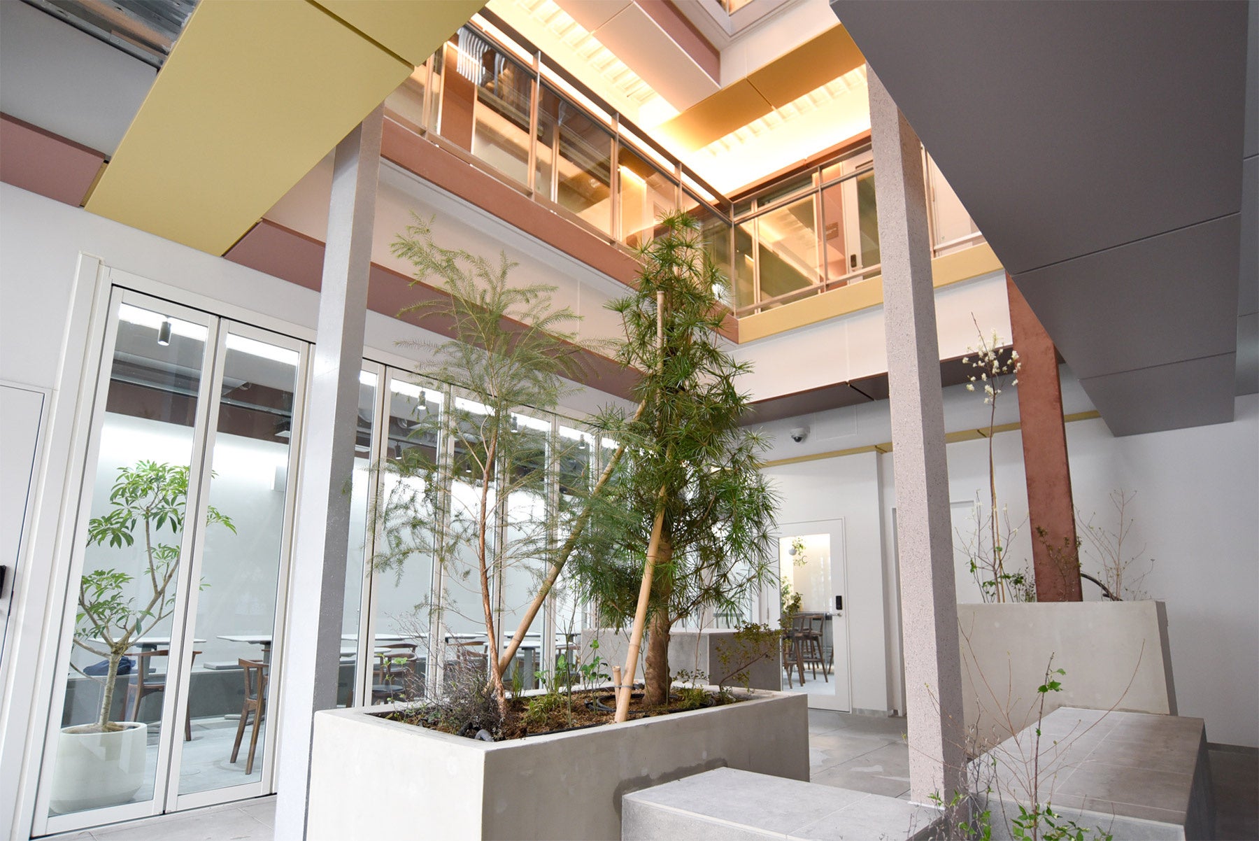 フレキシブルオフィス入居者が日常的かつ自由に利用可能なスペース。ラウンジは、全体またはエリアごとの貸切りにも対応しており、入居者は大人数での懇親会やイベントなどの用途で利用可能です。内部にはテキスタイルデザイナー安東陽子氏が製作したカーテンを設置し、日常的な演出およびエリアごとの仕切りにも活用いたします。テラスは、4階から屋上までつながる吹き抜け直下にあり、北谷公園にも視線が抜ける、開放感のある空間です。なお、ラウンジとテラスの間にある可動間仕切りを開くことで一体的に利用することが可能です。
