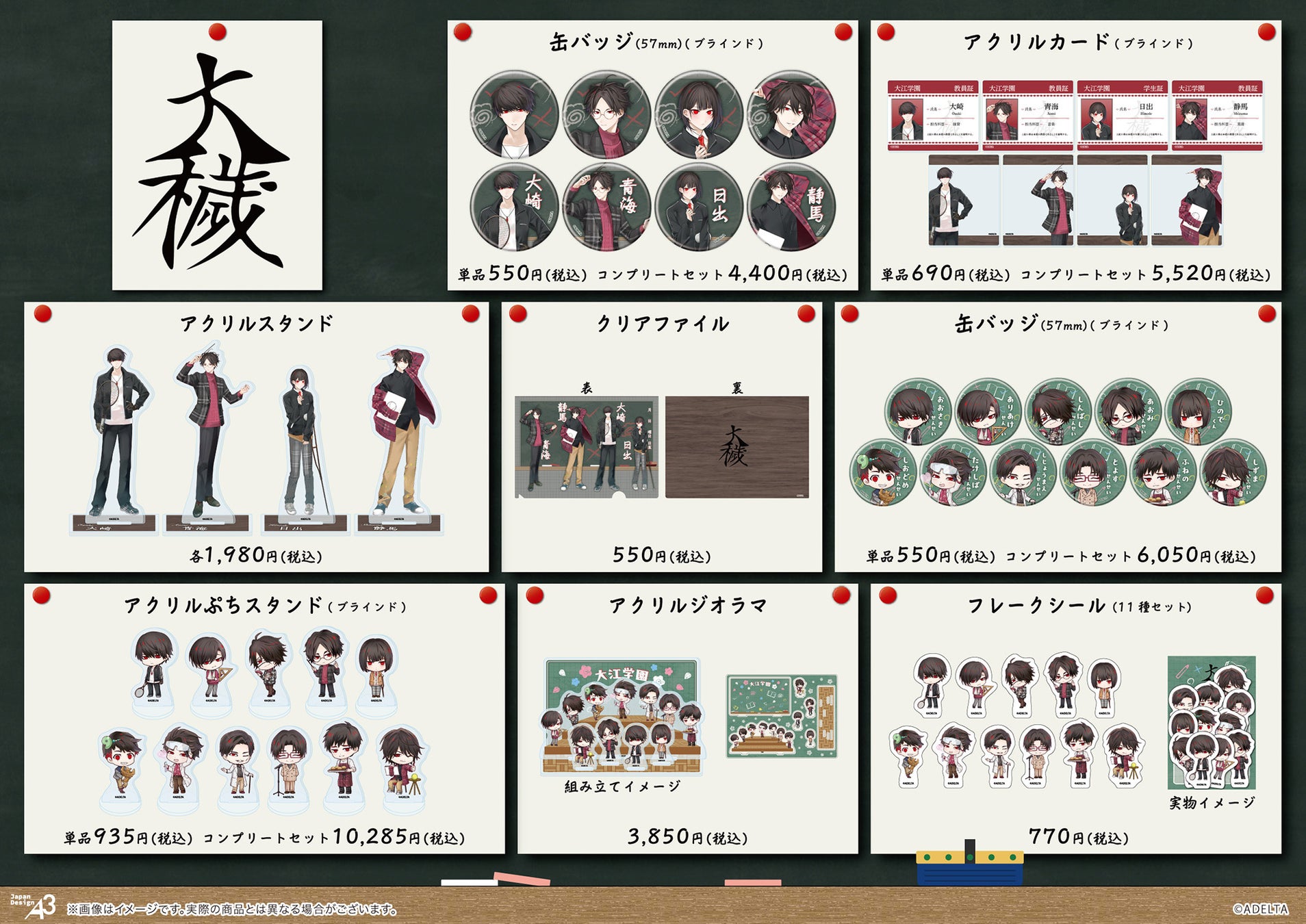今回のグッズには“学園風ver.”の描き下ろし&ミニキャライラストが使用されており、大崎たちキャラクター11人が教員や生徒の姿で登場。購入特典も用意されていますので、ぜひこの機会にチェックしてみてください!