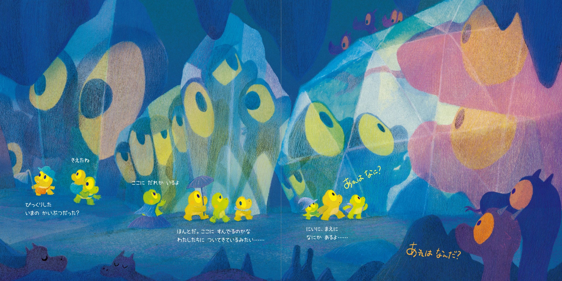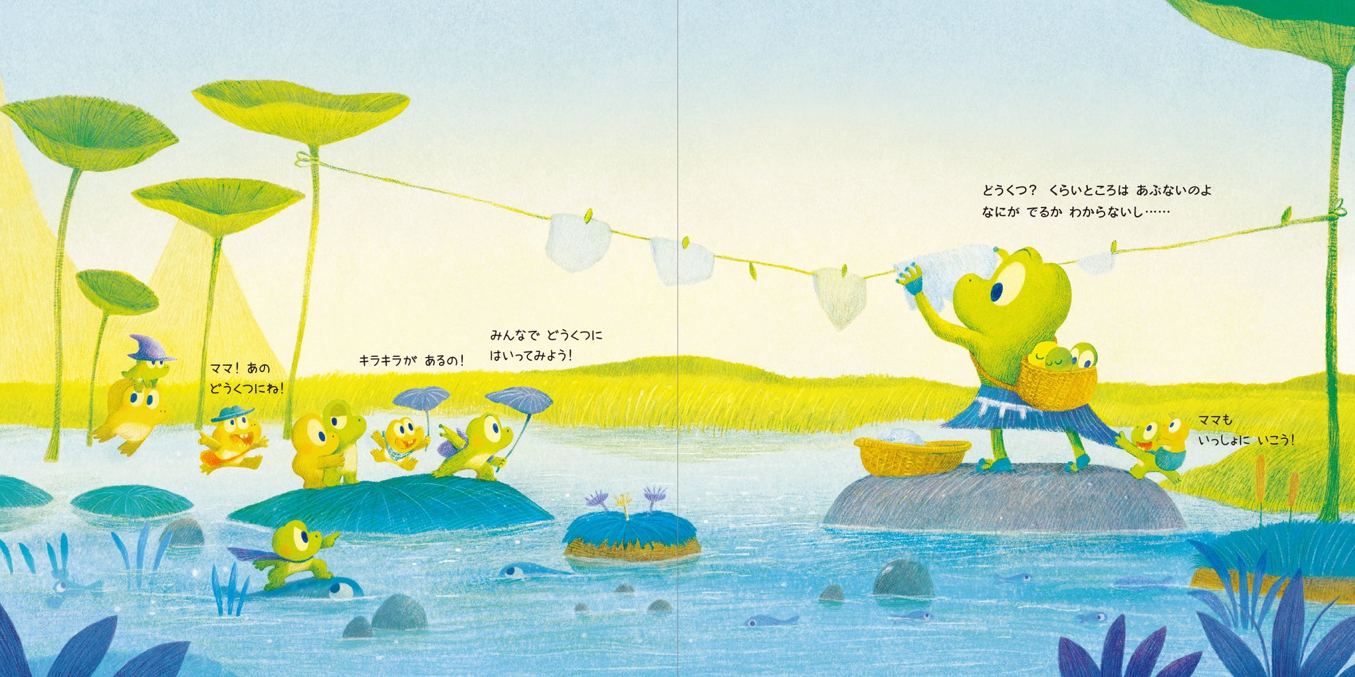 カエルの子どもたちがみつけた大きなどうくつ。暗闇の中でキラキラと何かが輝いています。その正体をたしかめようと、カエルたちはおそるおそる探検へと出かけますが……?
