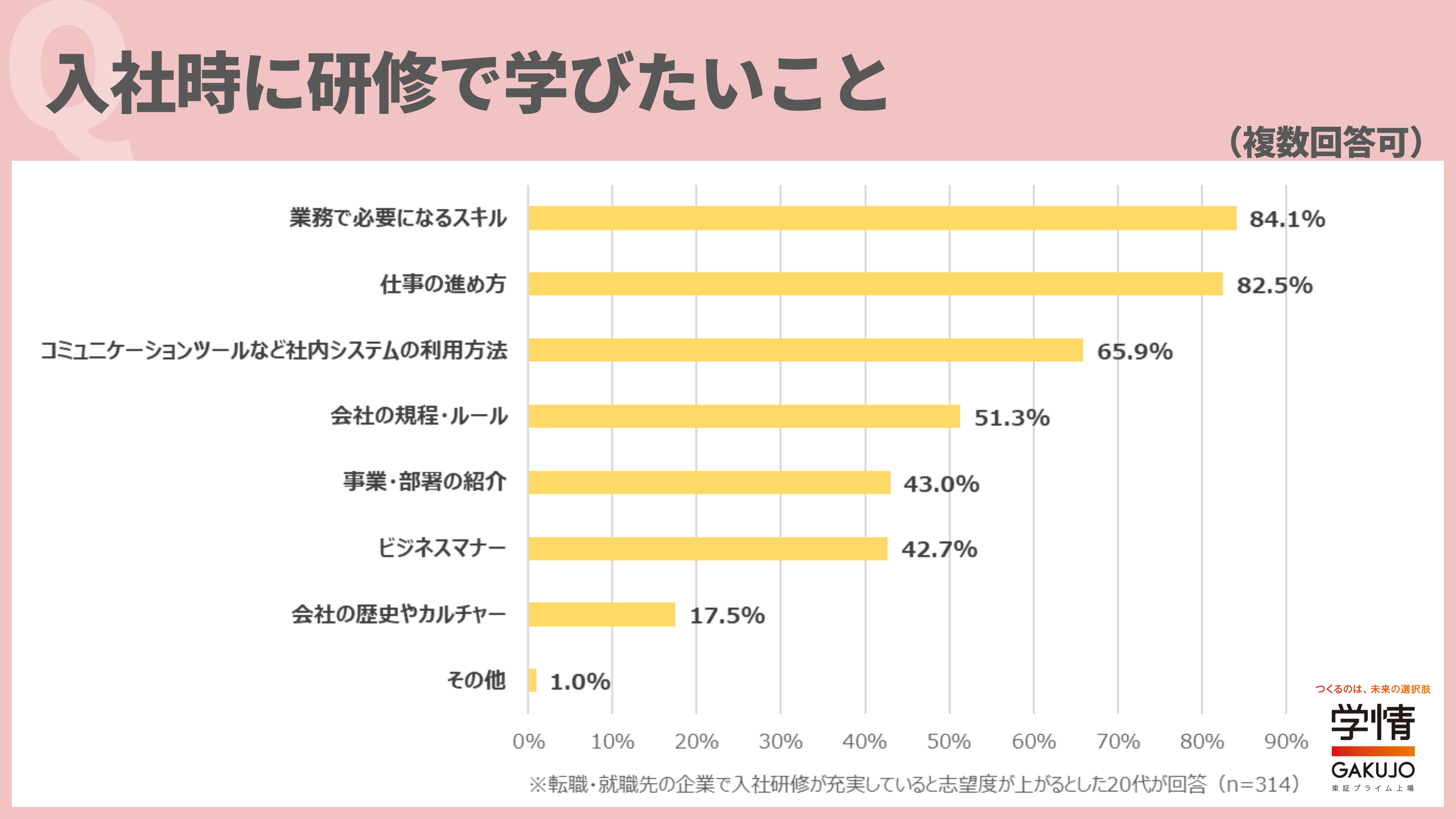 入社時に研修で学びたいことは、「業務で必要になるスキル」が84.1%で最多。次いで、「仕事の進め方」82.5%、「コミュニケーションツールなど社内システムの利用方法」65.9%、「会社の規程・ルール」51.3%が続きました。