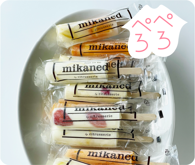 口当たりは「ひやひや、ぺろり」です。「いろんな種類の日本の柑橘を楽しむ氷菓」の意味を込め、みかんにedを付けて命名しました。へべす(ゆず)やサワーポメロ、マイヤーレモンなど、清涼感のある爽やかな組合せが人気。