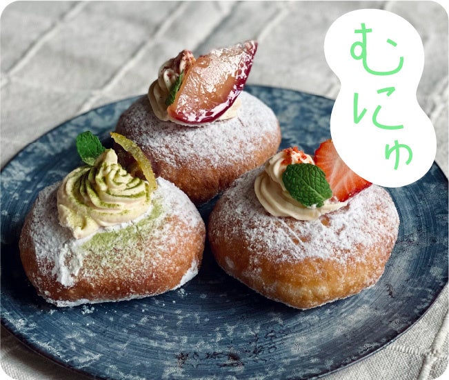 “むにゅ”ボンボローニ(イチゴとルバーブ・りんごと薔薇・柚子とあずき)各421円