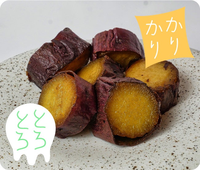焼きで甘さを最大限引き出したのちに、こめ油で揚げて皮はカリッと、中はトロッとした砂糖・甘味料不使用の体に優しいスイーツができあがりました。
