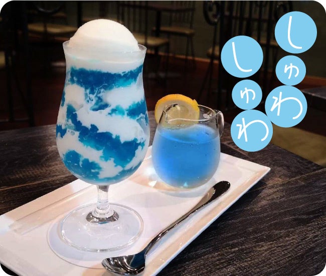 お好きなタイミングでしゅわしゅわっと別添えのブルーのソーダ水を注いで、お召しあがりください。