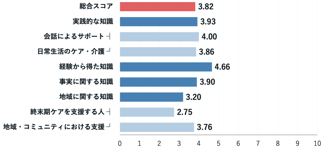 課題:「地域に関する知識」のスコアが10点満点中3.20点と、低い結果となりました。特に、終末期ケアを支援してくれる地域の団体や組織などを知っているかどうかについてはスコアが最も低く(10点満点中2.75点)、回答者の30%以上が最低スコアを付けていることが確認されました。これは、いざという時に地域で誰に助けを求めればよいか「全く知らない」人が相当数存在することを示しています。「日常生活のケア・介護」についてもスコアが低く(10点満点中3.86点)、多くの回答者が身体的なケアを行うことに対して準備不足を感じていることが明らかになりました。