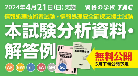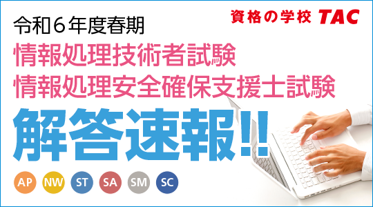 日商簿記検定試験、中小企業診断士、CompTIAなどの資格取得に向けた教育サービスを展開しているTAC株式会社(東京都千代田区、代表取締役社長:多田 敏男)は、4/21(日)実施の令和6年度春期 情報処理技術者試験・情報処理安全確保支援士試験の解答速報を4/23(火)より順次TACホームページで公開いたします。