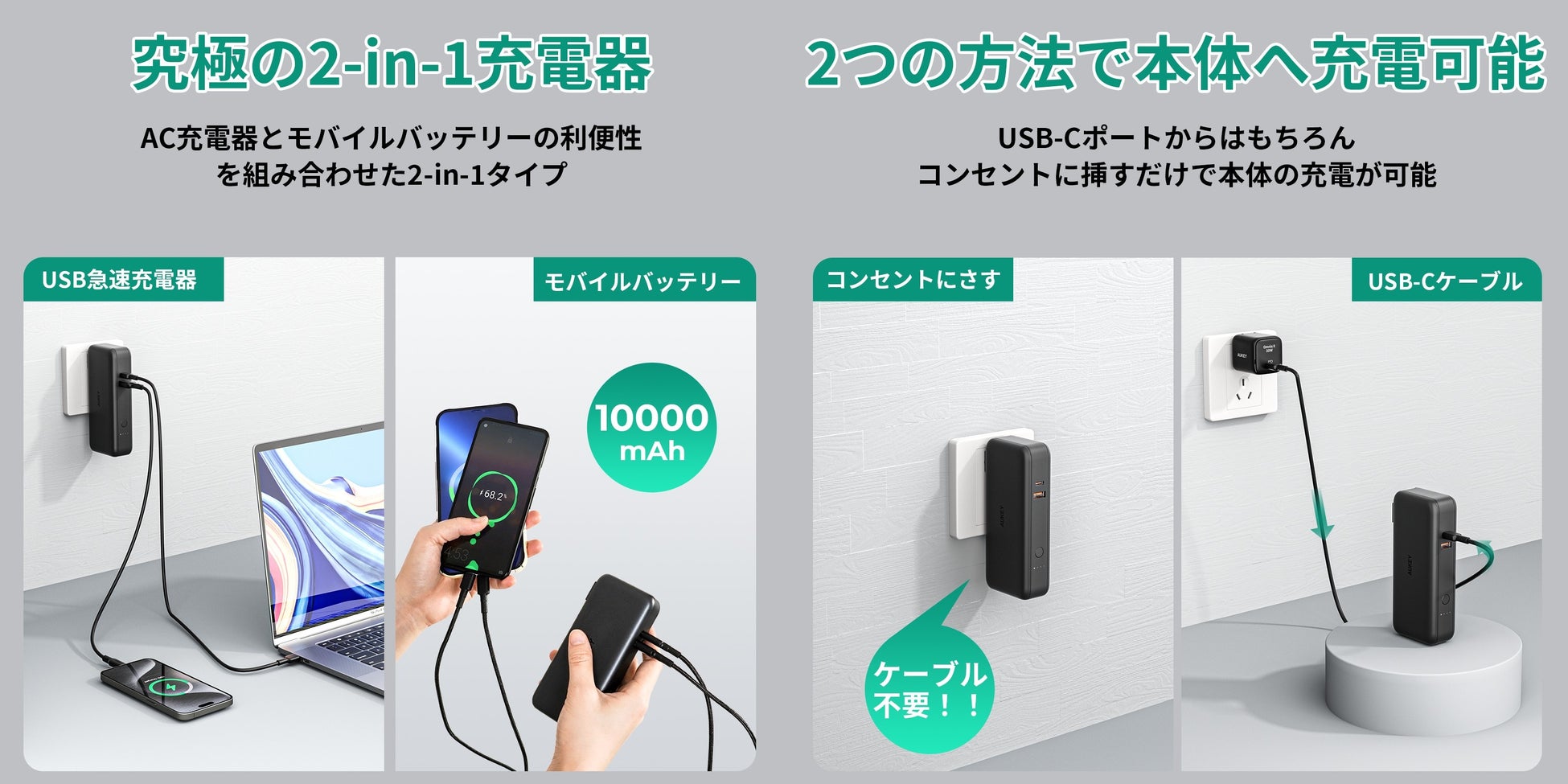 USB充電器としても、大容量の10000mAhのモバイルバッテリーとしても使えるコンセントプラグ付きの2-in-1充電器です。
