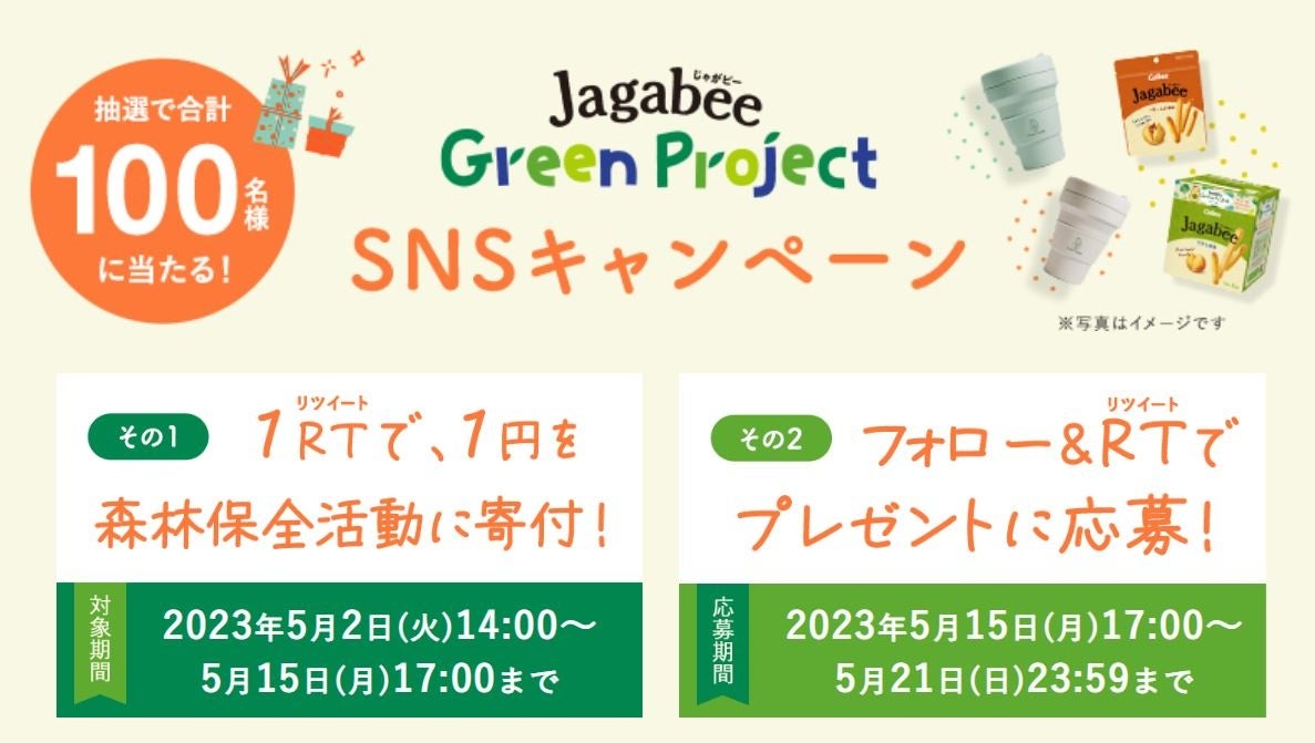 併せて5月4日の「みどりの日」に合わせ、5月2日からはSNSキャンペーンを実施。カルビーPR部公式Twitterで対象のツイートをリツイートすると1リツイートあたり1円がボルネオ保全トラスト・ジャパンに寄付される他、Jagabee『Green Project』限定グッズと商品詰め合わせが当たるキャンペーンも実施します。