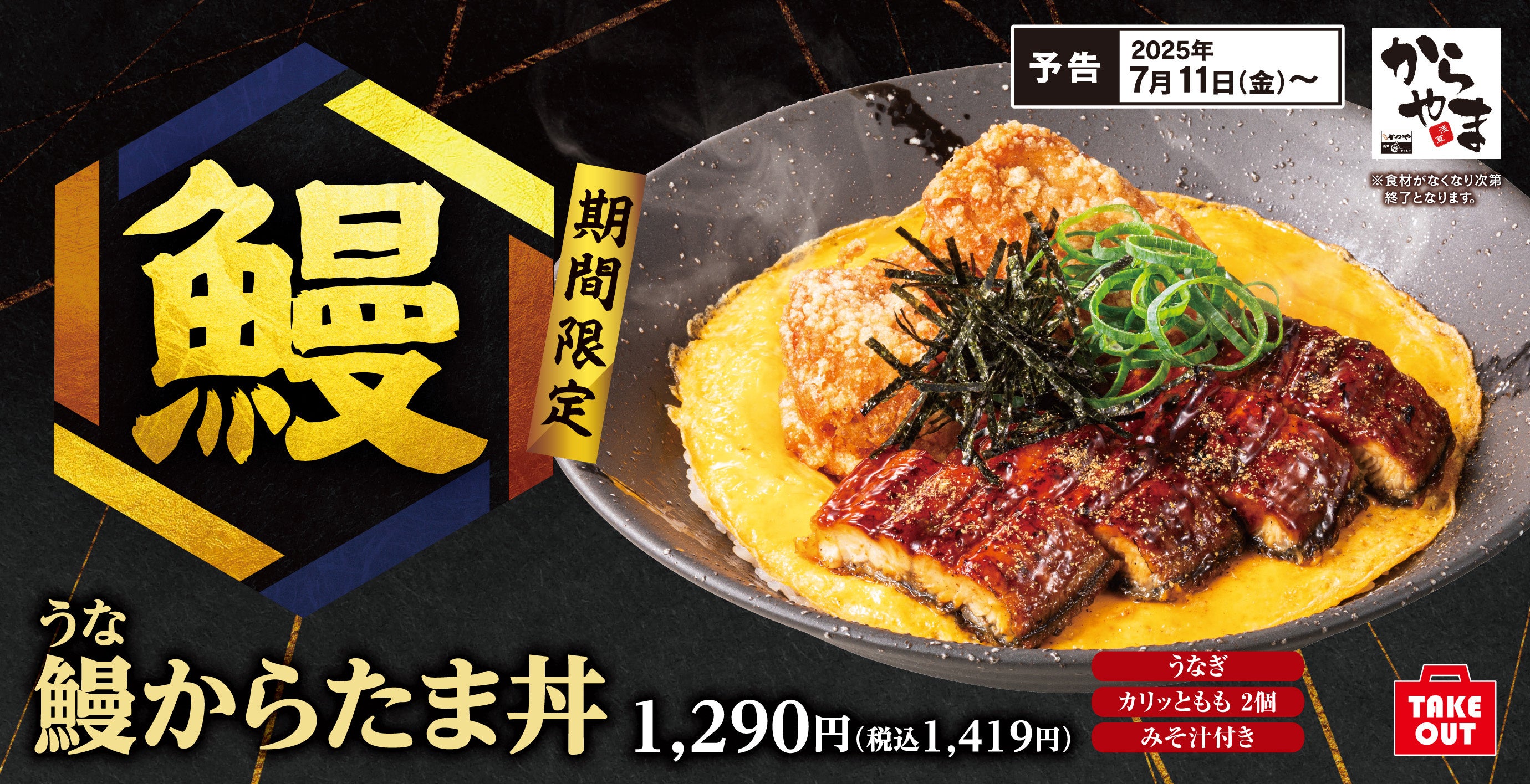 そんな時に、日常食の選択肢としておひとりさまはもちろん、ご家族連れで訪れやすい郊外やロードサイドに出店しているからあげ専門店「からやま」にて、鰻もからあげも選べる新メニュー「鰻からたま丼」と、こだわり抜いたからあげを堪能する「特選醤油からあげの濃厚つけから定食」を、2025年7月11⽇(金)より期間限定で販売開始いたします。
