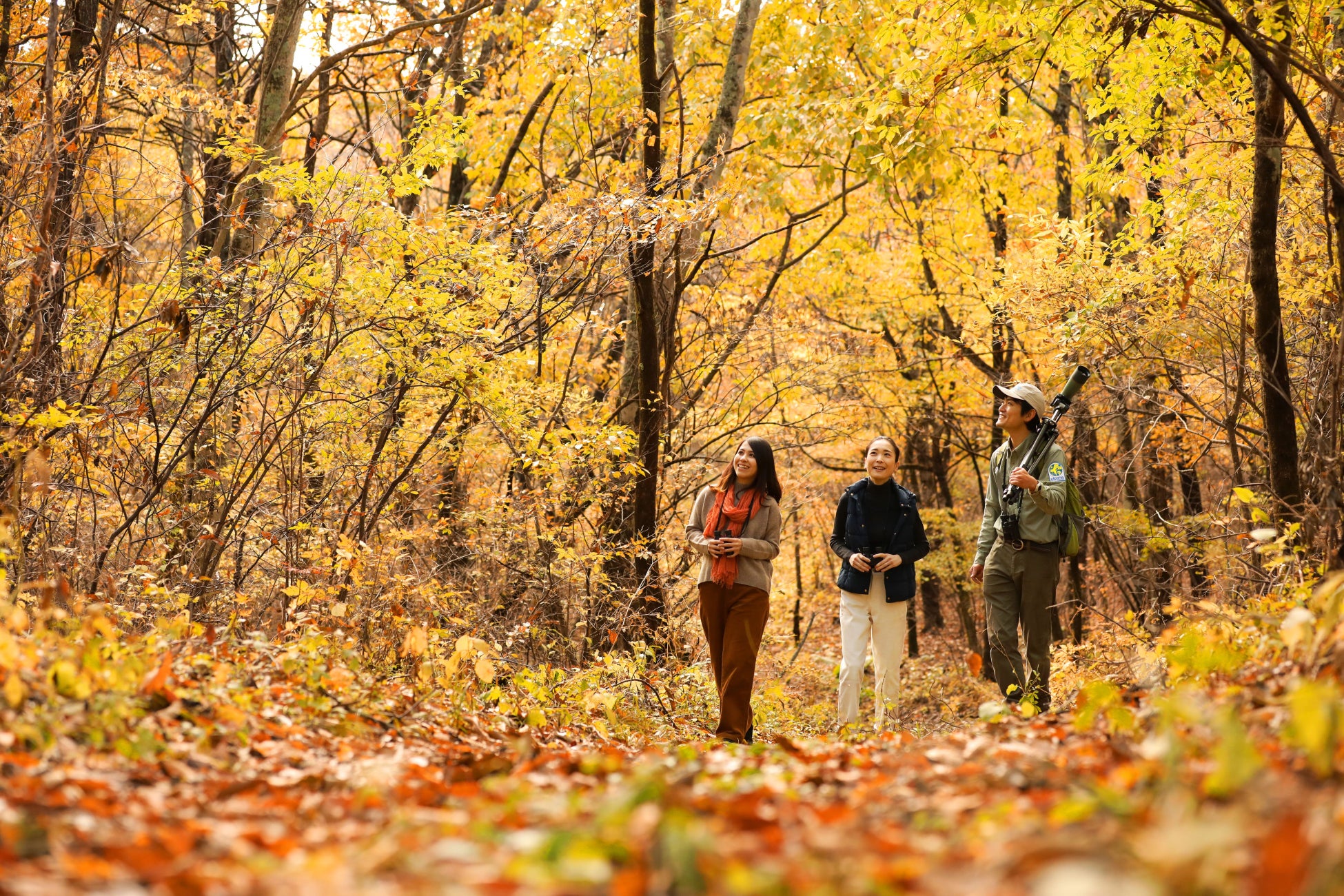 星のや軽井沢に隣接する軽井沢野鳥の森は、上信越高原国立公園の中に位置し、豊かな野生動物の宝庫です。年間で約80種類の鳥類が観察されるほか、ニホンカモシカを始めとしたさまざまな哺乳類も生息しています。日本固有の鳥獣類が24種ほど確認されており(*)、「豊かな森の象徴」と言われるツキノワグマも暮らす森です。森には遊歩道が整備されていて、春には本格的な望遠鏡を携えたバードウォッチャーで賑わいます。また、夏には緑豊かな森の中での森林浴、秋には紅葉、冬には雪の上にノウサギなどの動物たちの足跡を見つけることができ、四季を通して様々な表情を愉しむことができます。