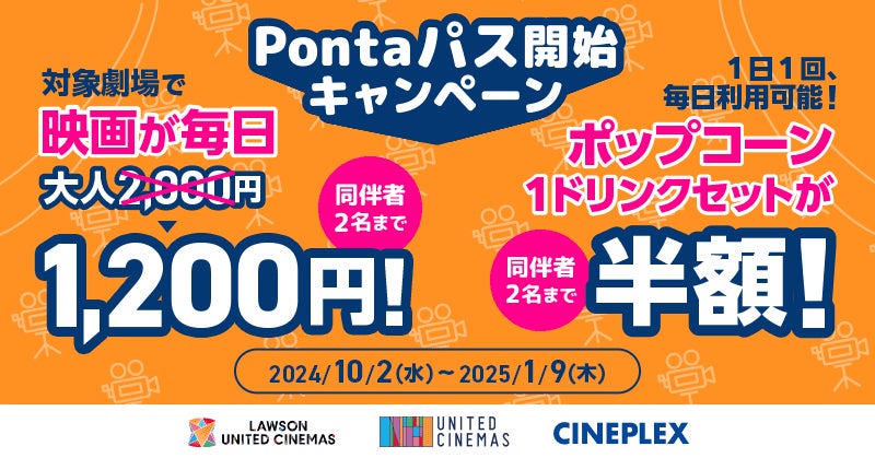 この度、「Pontaパス」のサービス開始を記念し、全国のローソン・ユナイテッドシネマ系列劇場にて、通常1,400円で映画をご鑑賞頂ける「auシネマ割」が2024年10月2日から2025年1月9日までの期間、1,200円でご利用いただけます。期間中は同伴者様2名まで何度でもご利用が可能です。