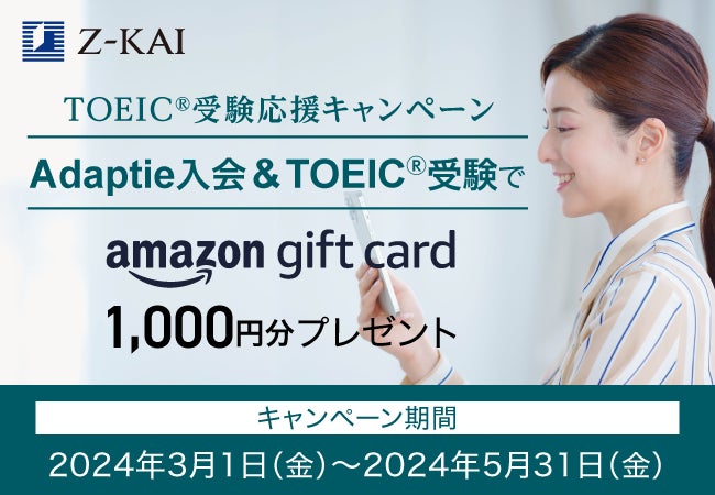 TOEIC®対策講座Adaptieに入会し「TOEIC®Listening & Reading Test」への申込完了報告で、Amazonギフトカード1,000円分プレゼントのキャンペーンを開始。