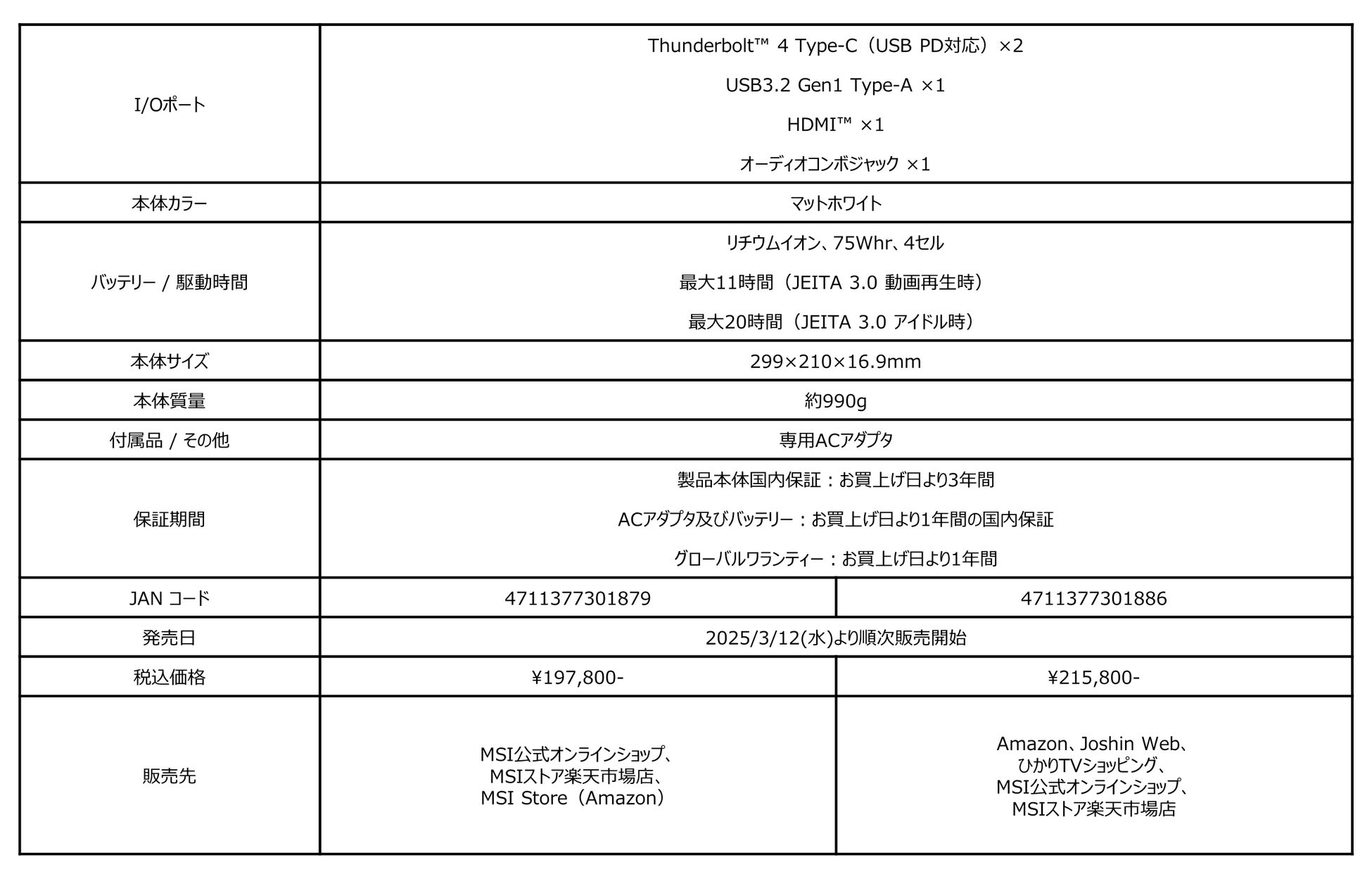 この度、エムエスアイコンピュータージャパン株式会社は、軽さ990gの本体に「インテル® Core™ Ultra プロセッサー(シリーズ 1)」を搭載した13.3インチタイプのパワフルビジネスノートPC「Prestige 13 AI Evo A1M」シリーズより、32GBの大容量メモリを搭載したMSI公式オンラインショップ(以下、MSIストア)にて2025年3月12日(水)より発売いたします。
