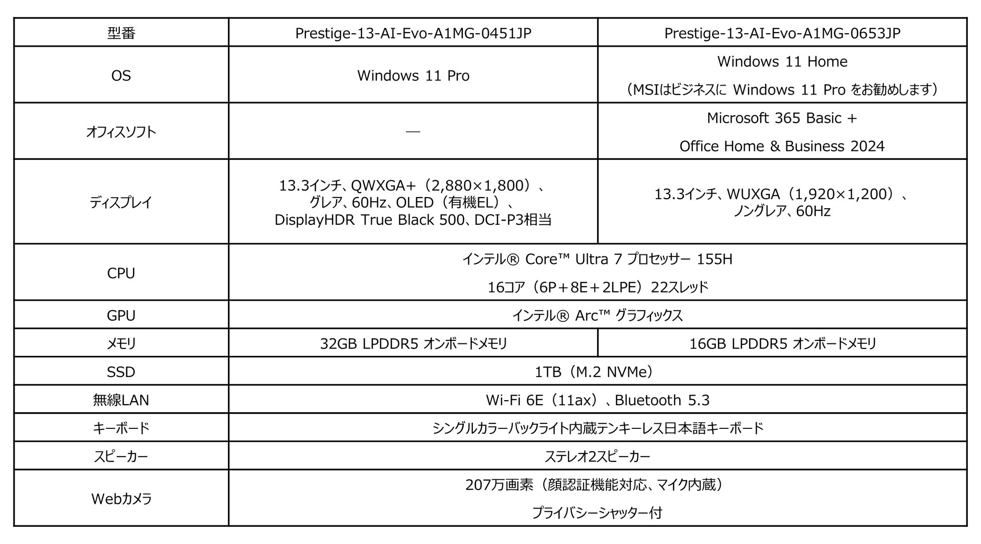 また、オフィスソフトの最新版「Microsoft 365 Basic + Office Home & Business 2024」をプリインストールしたオンラインストアモデル「Prestige-13-AI-Evo-A1MG-0653JP」を同時発売いたします。