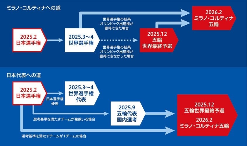なお、日本がオリンピックに出場するためには、2024年並びに2025年世界カーリング選手権大会の順位に応じて与えられるポ イントの合計上位7か国(開催国イタリアを除く)に入るか、オリンピック直前に開催される「オリンピック出場最終予選会」に出 場して上位2チームになることが出場条件となります。