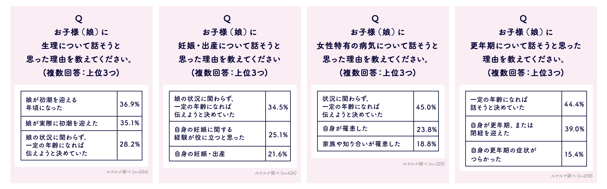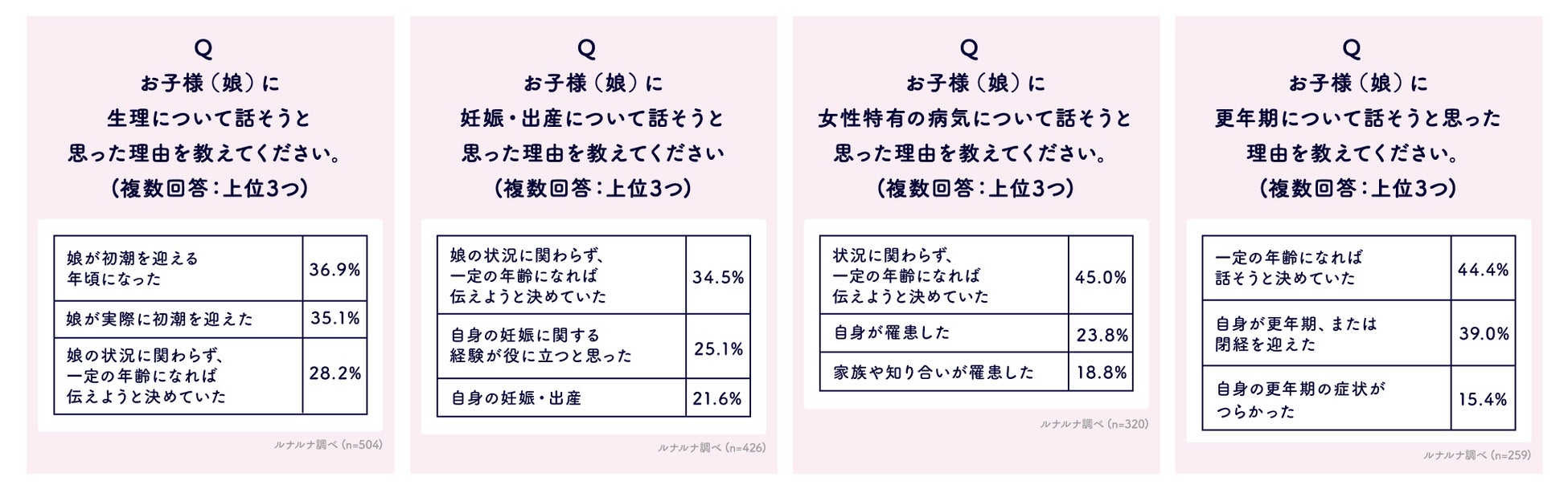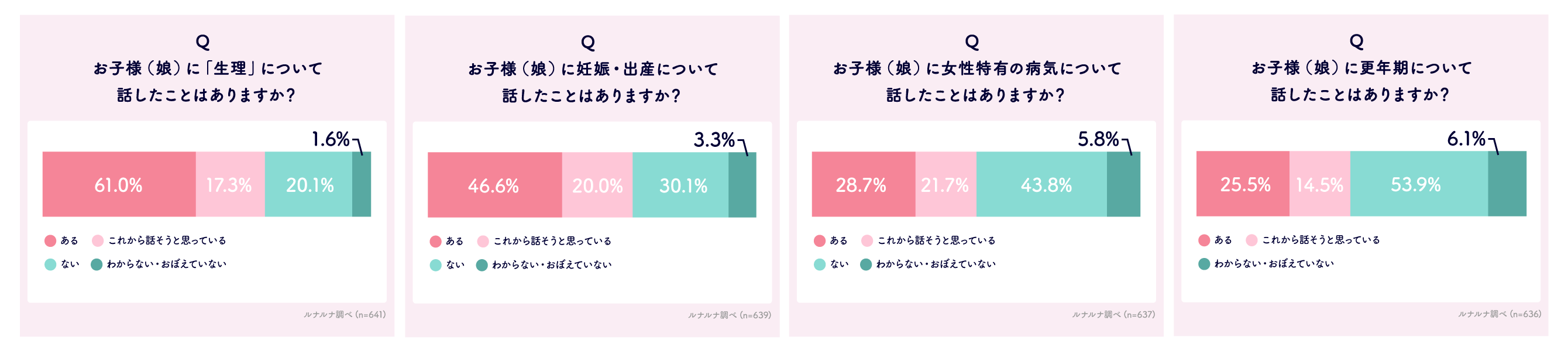 続いて、現在子ども(娘)がいるルナルナユーザーに、「生理」「妊娠・出産」「女性特有の病気」「更年期」の4つの項目についてそれぞれ話したことがあるかを聞いてみました。