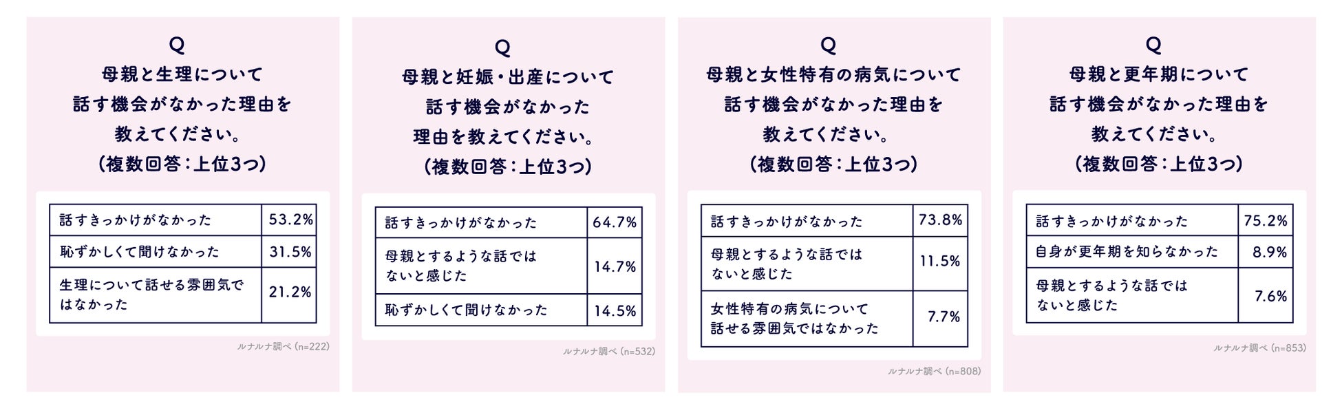 では、母親と「生理」「妊娠・出産」「女性特有の病気」「更年期」について、話したことがないと回答した人にその理由を聞いてみました。4項目ともすべて、「話すきっかけがなかった」(生理:53.2%、妊娠出産:64.7%、女性特有の病気:73.8%、更年期:75.2%)が最も多く、2位に少なくとも20ポイント以上差をつける結果となりました。女性の健康に関する話題はセンシティブなことも多く、何かしらきっかけがないと話しづらいと感じていることがうかがえます。