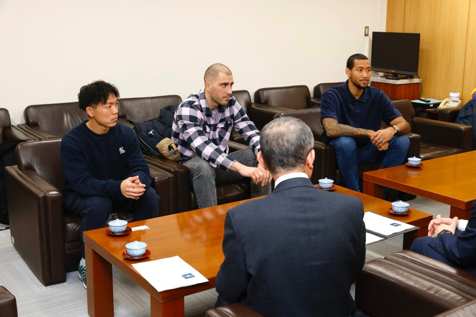 表敬訪問には、出場選手を代表して伊藤尚人選手(SHINAGAWA CC WILDCATS.EXE/仙台大付属明成高校出身)、ドゥシャン・ブルト選手(LAUSANNE(スイス)/東京2020オリンピック:セルビア代表(銅メダル)、ウェスター・モルティニ選手(LAUSANNE(スイス)/FIBAランキング:スイス1位)が出席。藤本副市長から激励のお言葉をいただきました。