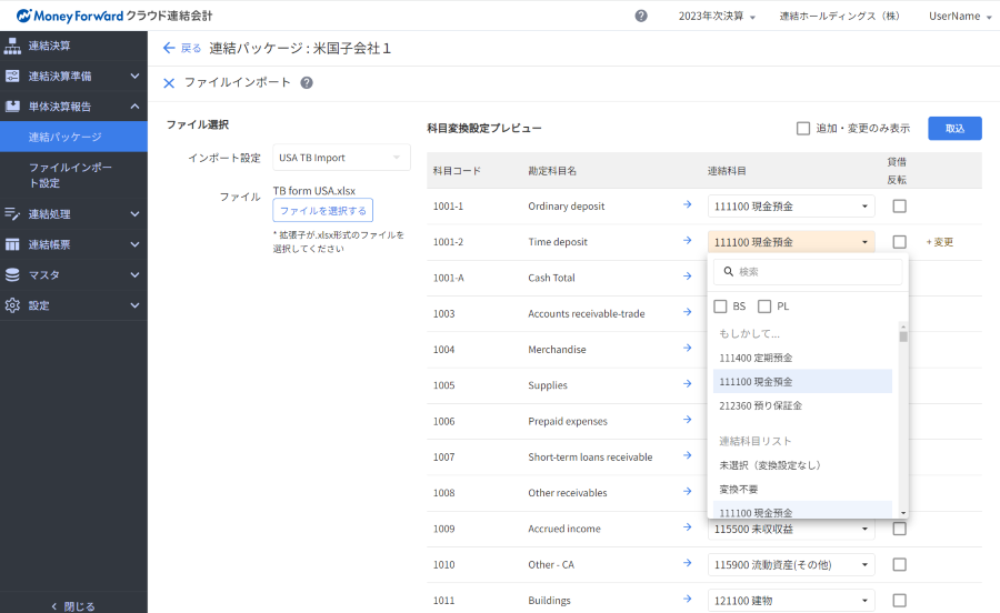 連結決算業務は、グループ各社の個別財務諸表データを収集し、勘定科目を連結の統一科目に修正する必要があります。『マネーフォワード クラウド連結会計』ではこれまでも、Excelファイルまたは連携サービスから連結パッケージのデータを取り込み、グループ各社の勘定科目を連結科目に変換できる機能を提供してきました。取り込んだ勘定科目の情報や、過去のインポート時の変換設定をもとに、変換先の統一科目が自動で提案されるため、手間なくデータ登録を行うことが可能です。