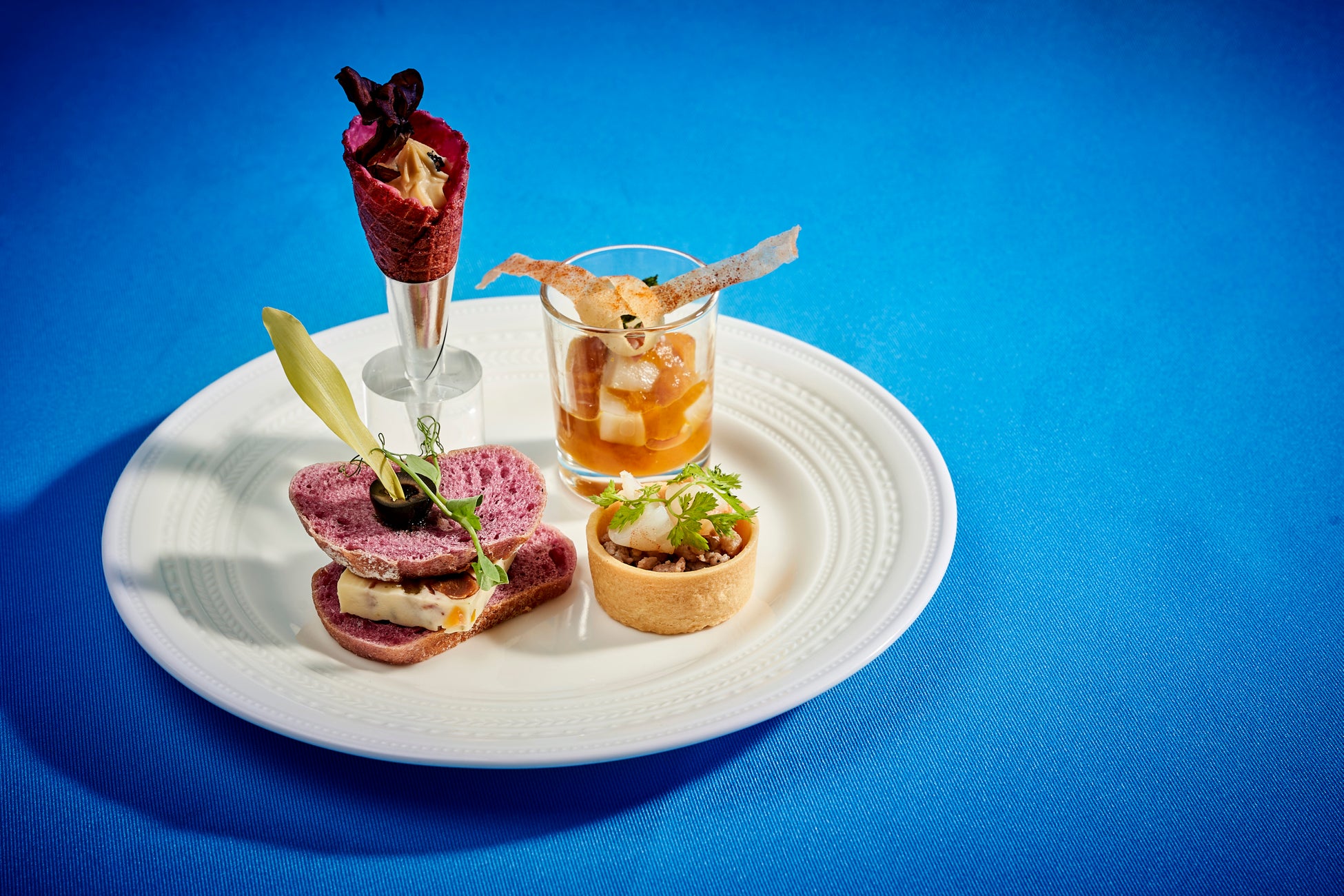 セイヴォリーにも「トリュフ風味のクリームチーズ 舞茸 炭塩 ビーツコーン」、「ドライフルーツとナッツのチーズテリーヌ バルサミコ 赤ワインブレッド」、「帆立貝 南瓜のピュレ 魚介のスープ仕立て」など、ラグジュアリーブランドにふさわしく、かつ季節を取り入れた食材を用いています。