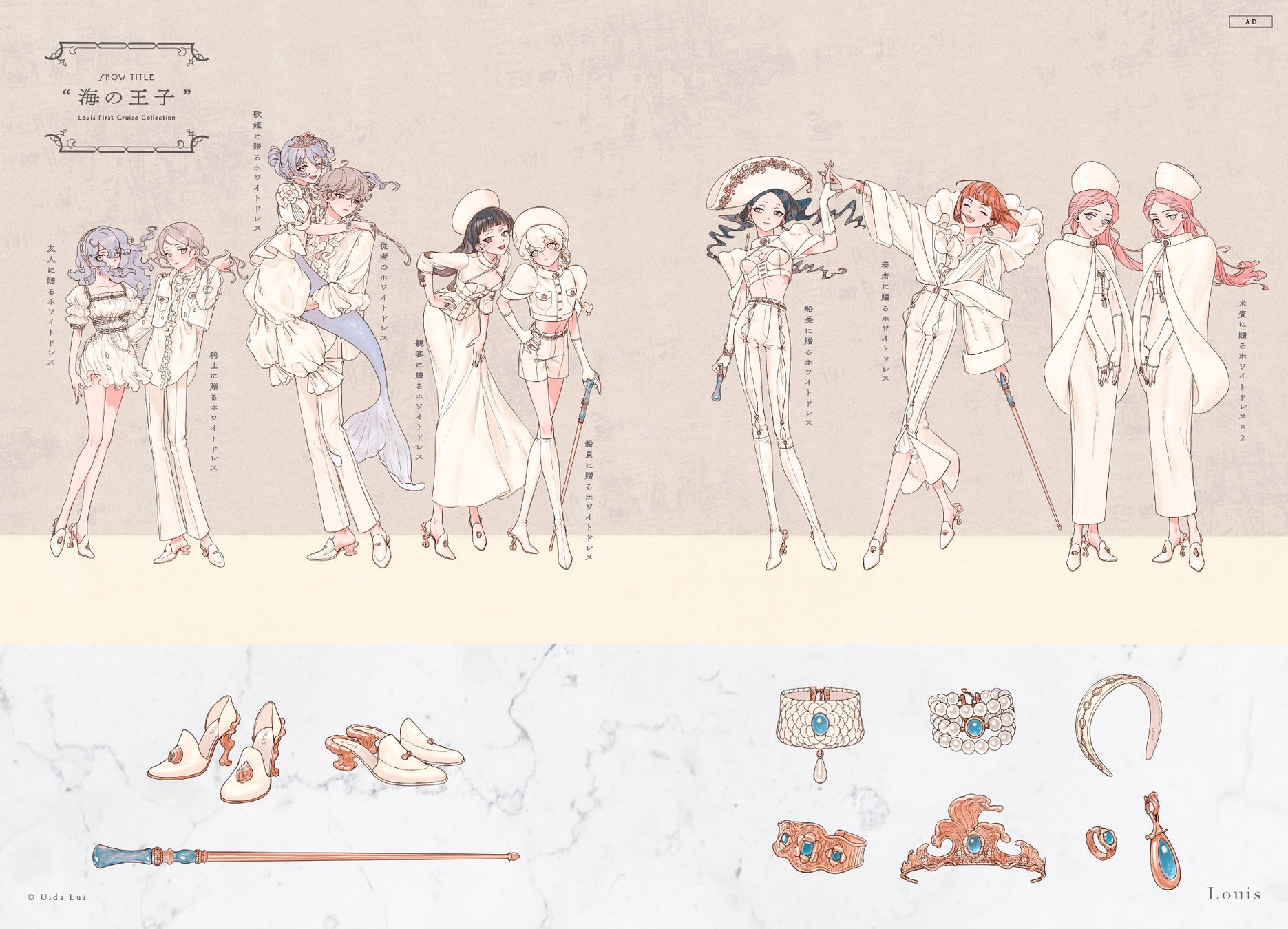 リング、ピアス、ネックレスやブレスレットをはじめ、帽子、ベルト、ヘアアクセ他、リボンやパール、チェーンといった素材の質感やシルエット、金属の光沢感や繊細なディテールの描き込みは必見。