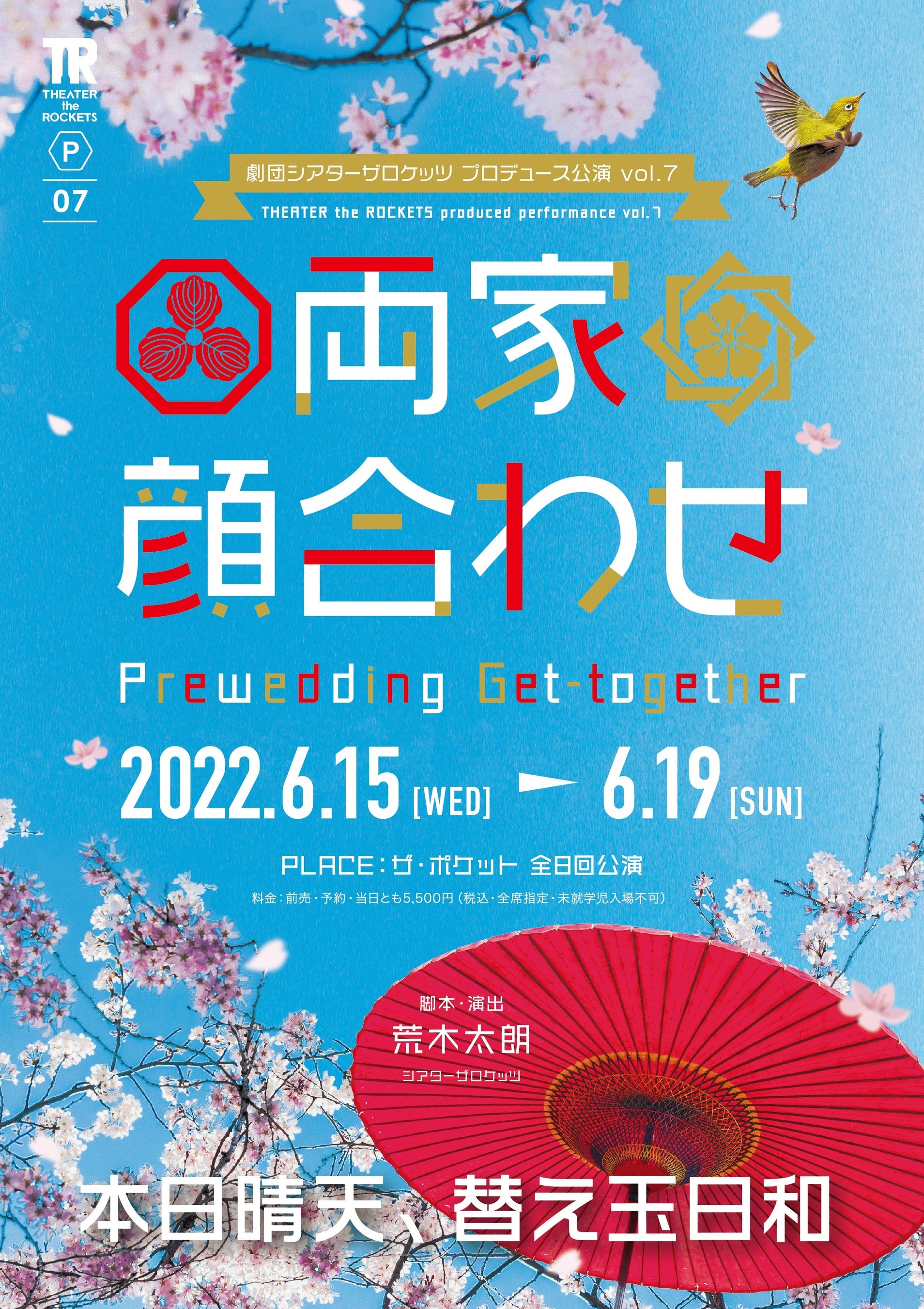 劇団シアターザロケッツ(主宰:荒木太朗)主催、劇団シアターザロケッツプロデュース公演vol.7『両家顔合わせ』が2022年6月15日 (水) ~2022年6月19日 (日)にポケットスクエア ザ・ポケット(東京都中野区)にて上演されます。チケットはカンフェティ(運営:ロングランプランニング株式会社、東京都新宿区、代表取締役:榑松 大剛)にて発売中です。