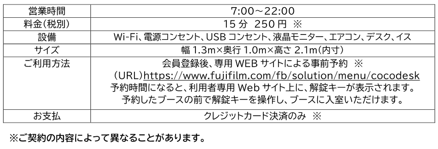 なお、「CocoDesk」は、東京メトロ駅構内以外にも、都内のオフィスビル等に設置されております。設置場所の詳細は、Webサイト(https://www.fujifilm.com/fb/solution/menu/cocodesk)をご確認ください。